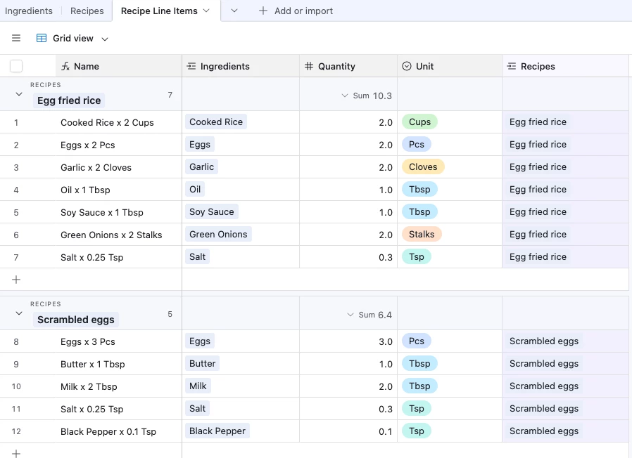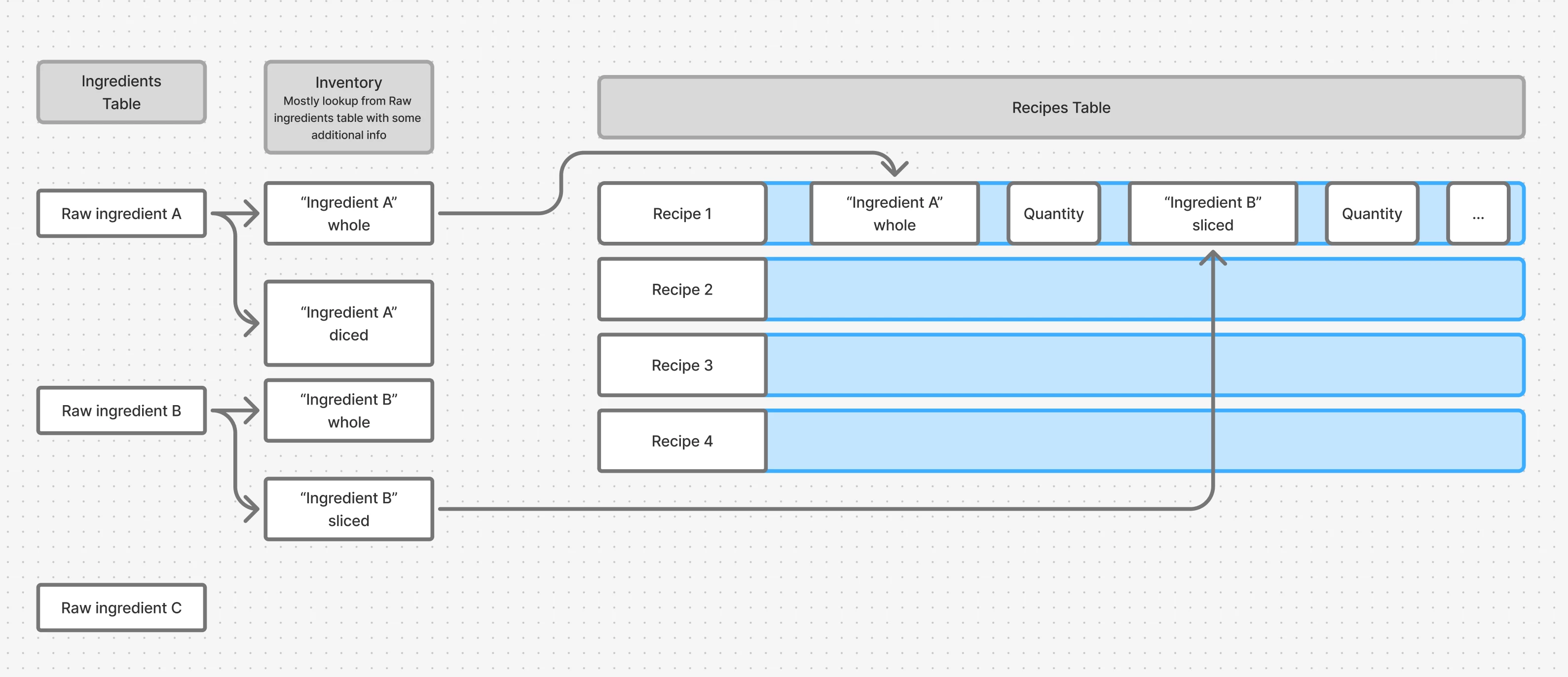 I am a chef, working on a tool for our restaurant to track costs and recipe development trial and error. I have three tables set up - one for ingredients (has metrics like cost, case size, purveyor, etc). Then there’s an Inventory table, which is effectively looking up ingredients and attaching additional attributes like whether or not something is ‘on hand’ or whether it’s been prepared in one way or another. These records then go into the Recipes table where (like any recipe) they need to have quantities unique to the recipe. I have figured out how to manage recipe price tracking, instructions (long text field), etc..