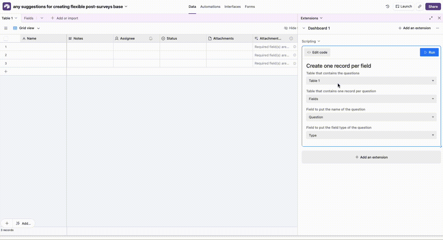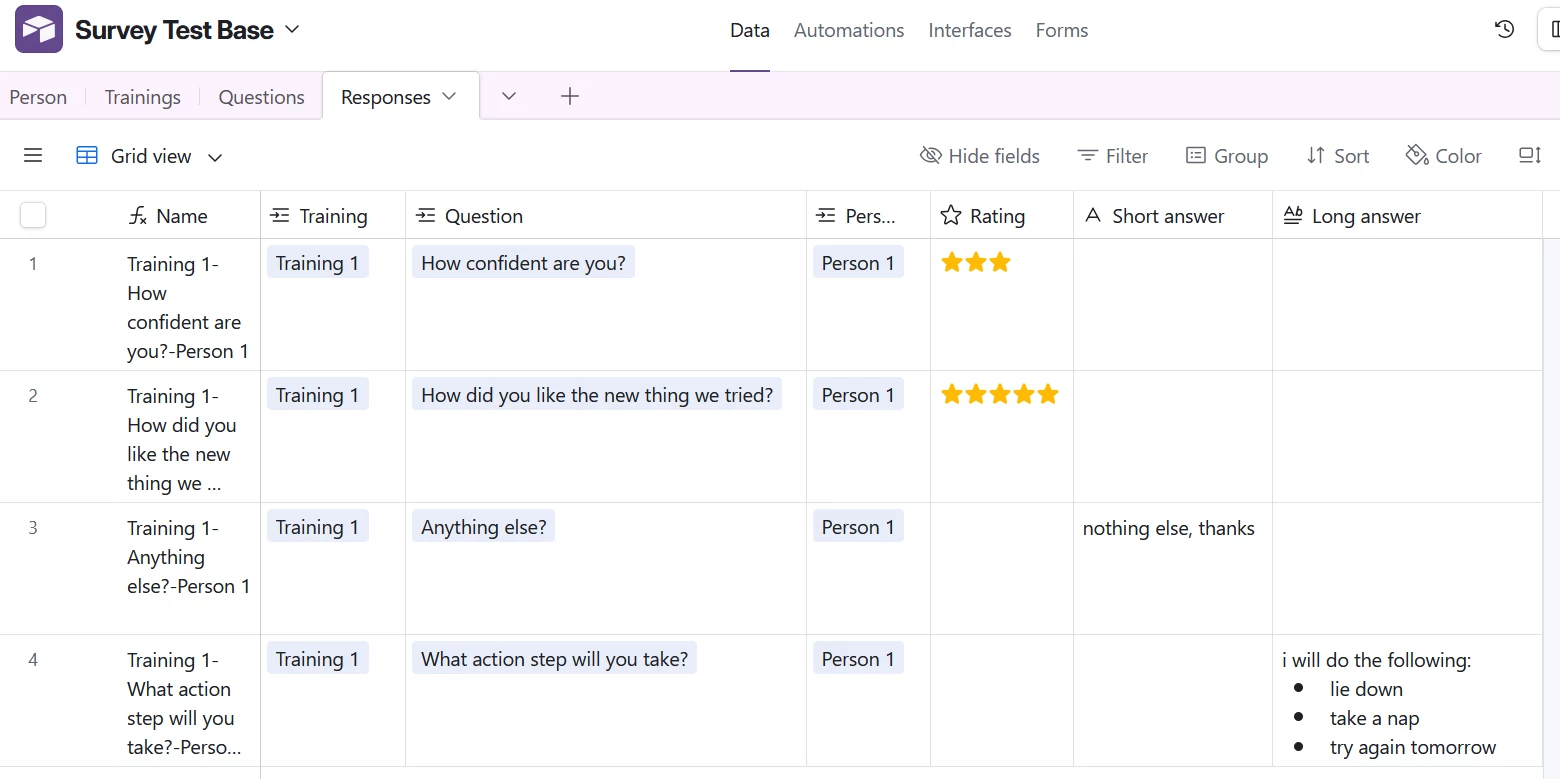 right now, i have one table called post-surveys where each field corresponds to the questions we ask, and the field names are shortened versions of the questions. then we build the form for each post-survey based on which questions we’d like to include. the downside is that it means that table has a huge number of fields and it’s hard to see if the question you want to include already exists as a field or you need to create a new one. (e.g. “S3 FSOW: Challenges” means in session 3, we had a question about challenges that related to the reasons we did the session, you can see how that makes it hard to keep track of the actual question)