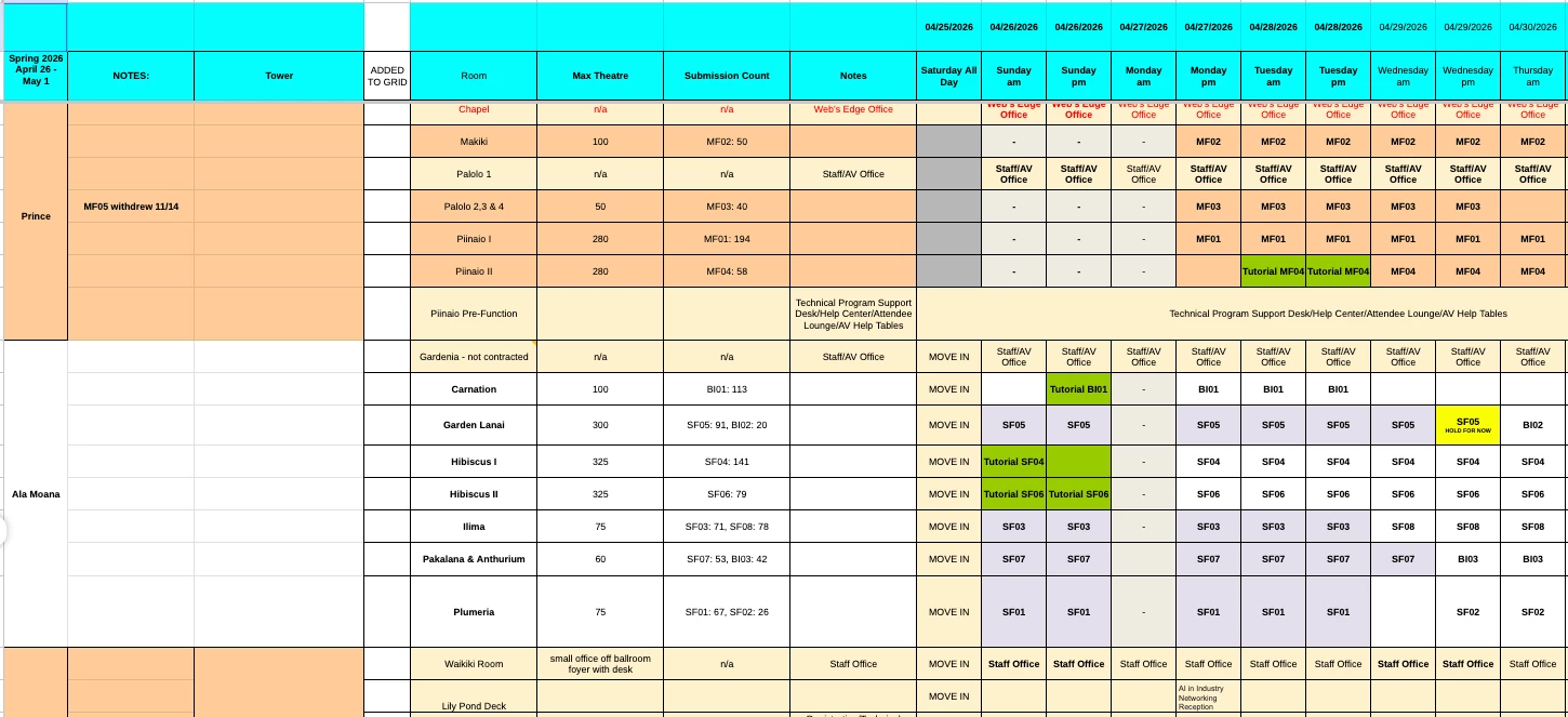 Attached is a screen shot of a small part of a schedule of conference that a large number of rooms (80) across 4 hotels