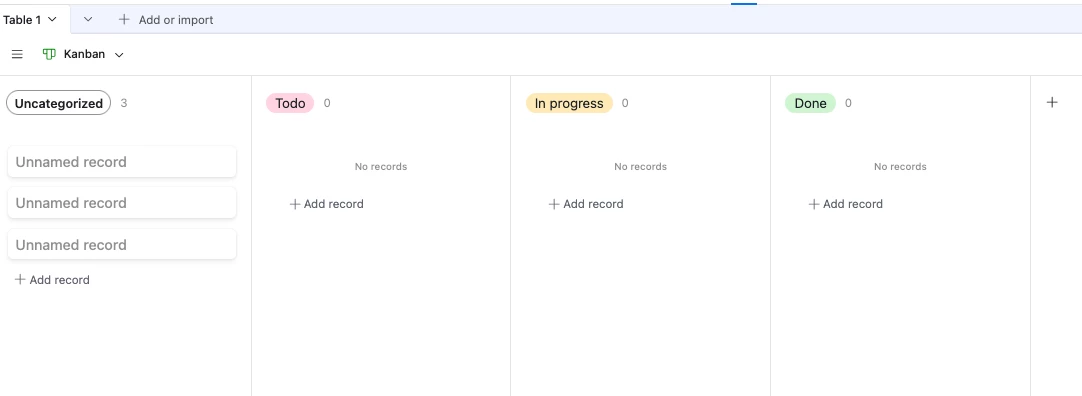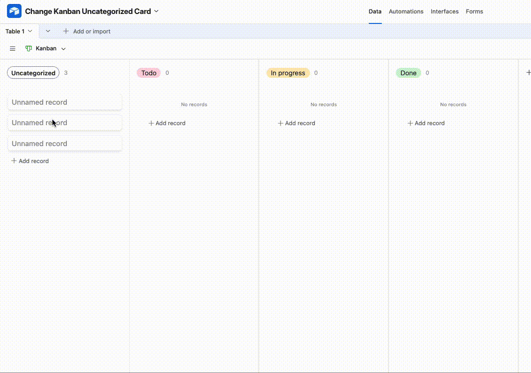 In Kanban view, all cards are listed under Uncategorized