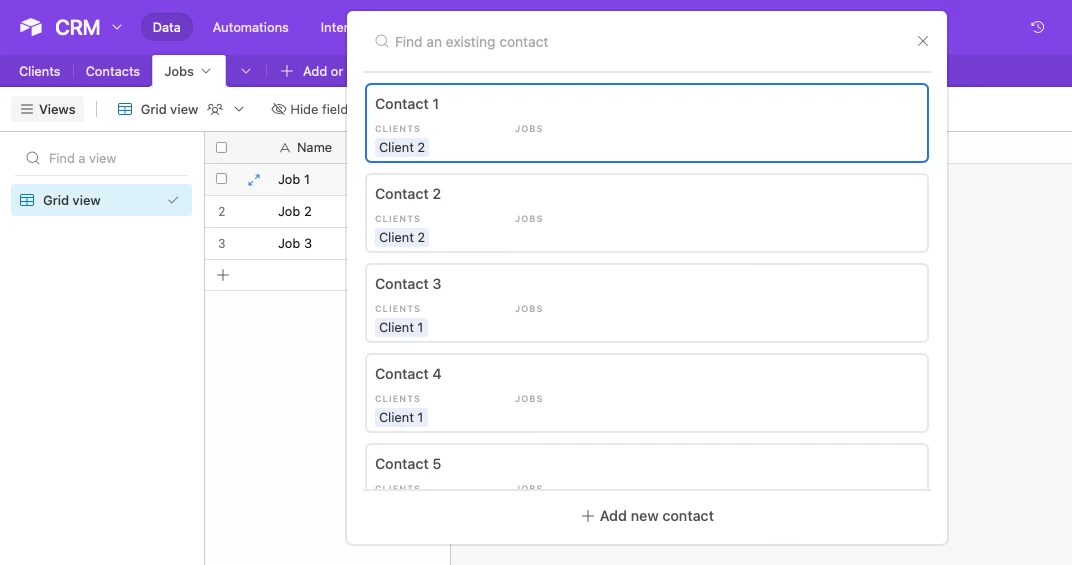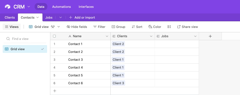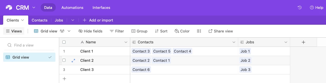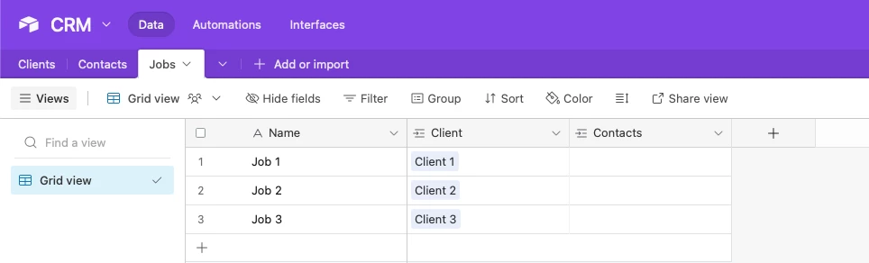 The clients table has linked records to contacts to denote all the contacts that we work with at that client. And linked records to jobs to denote all the jobs we are working on with that client. A client can have multiple linked contacts and multiple jobs, but contacts and jobs can only be linked to one client.
