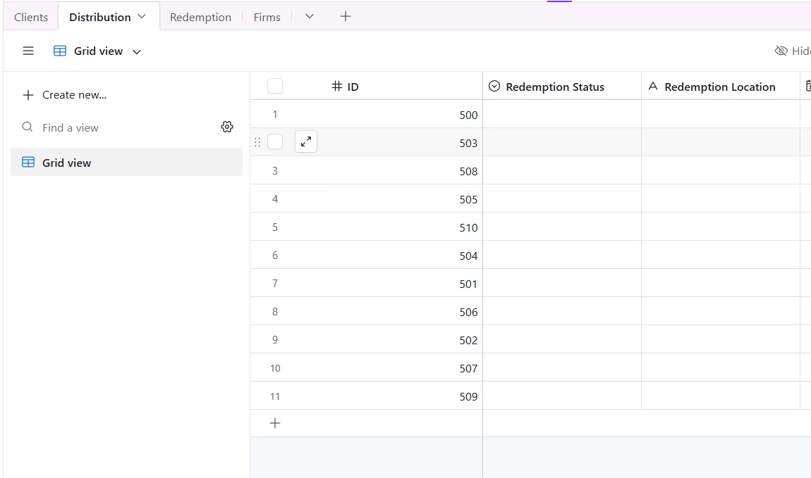 I currently have a table set up for “patients” where health workers would assign the coupons. Then I have a table for “Coupons” where I’d like the records to be each coupon code distributed.