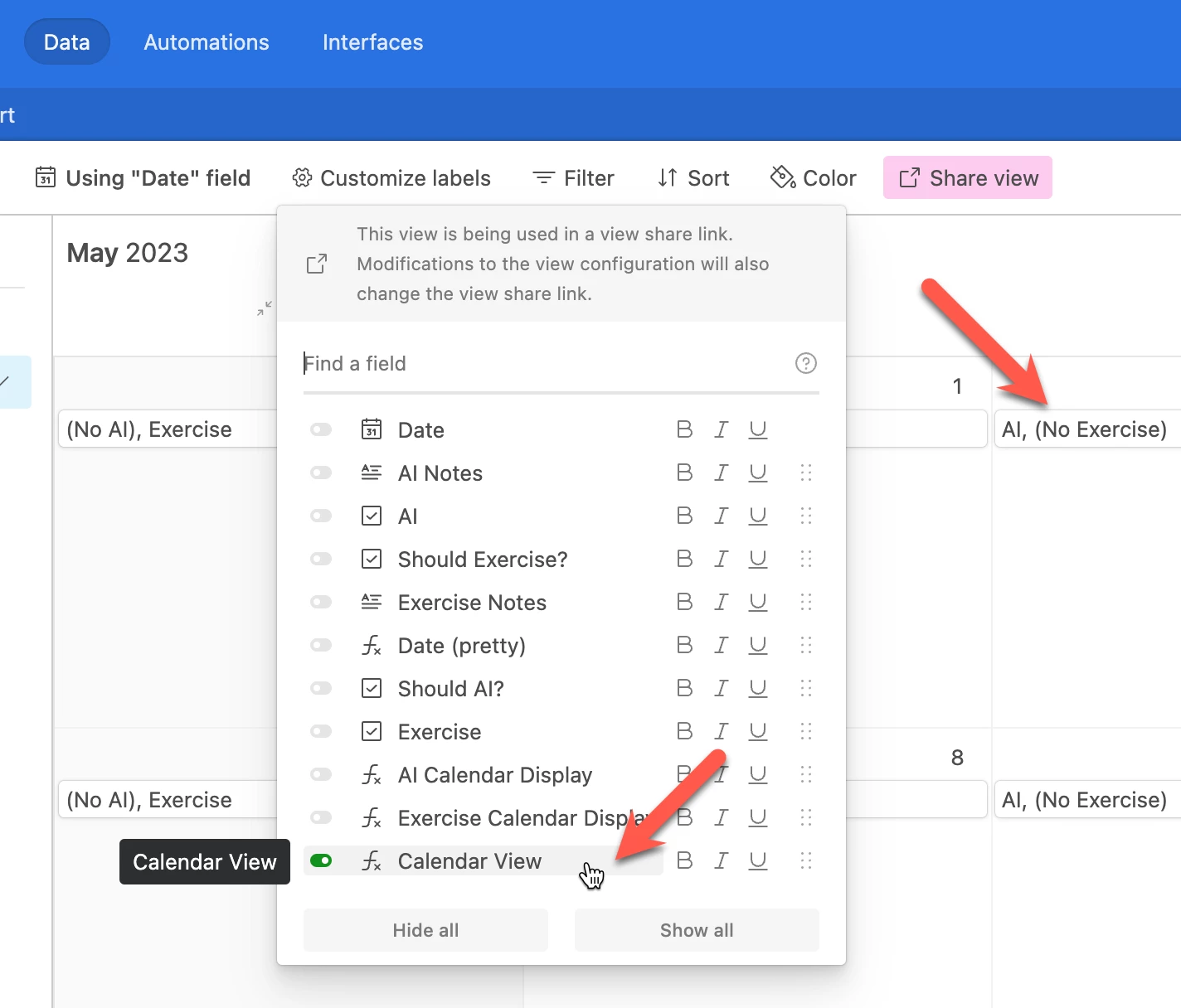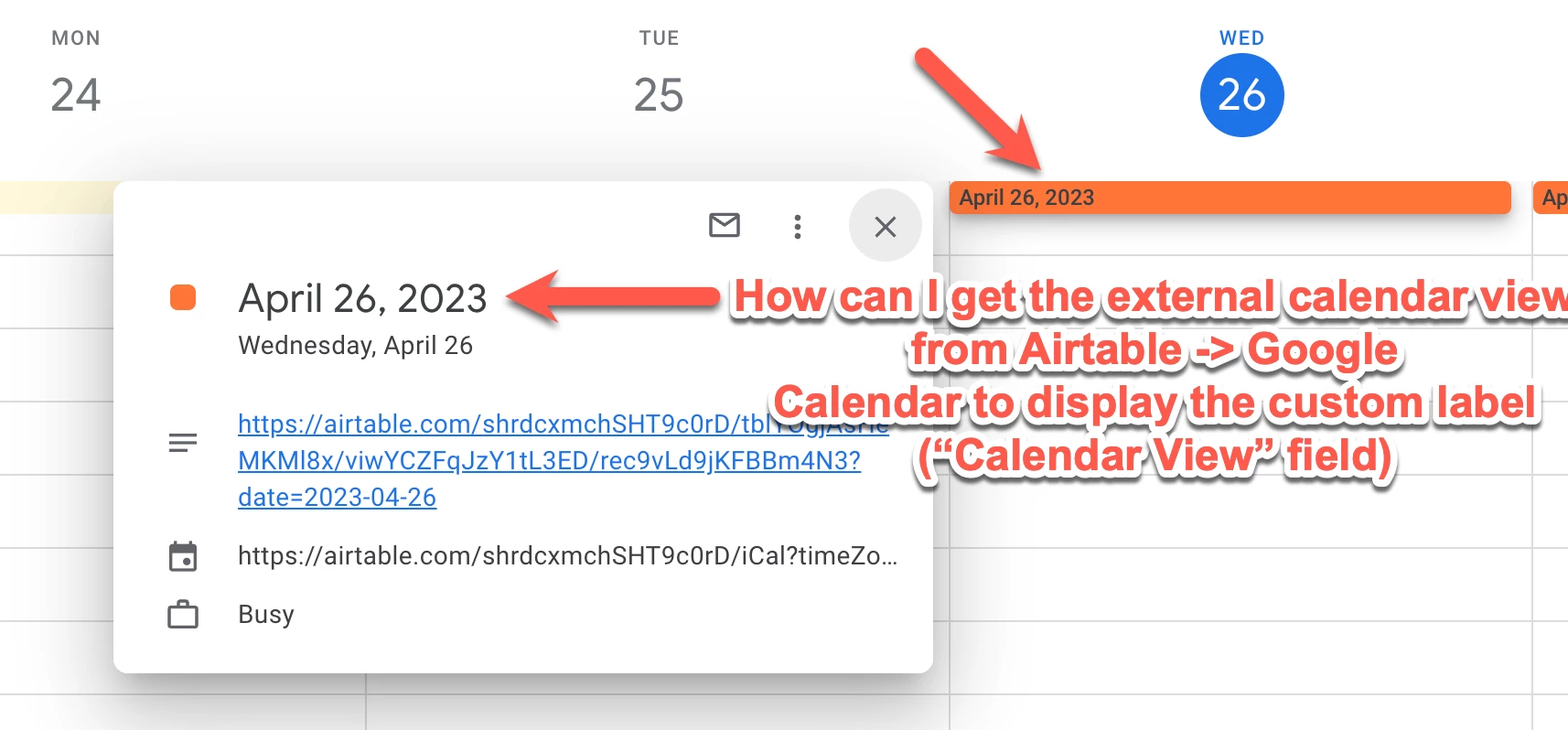 I'm using a Calendar view, the "Customize labels" option, and the "Sync to an external calendar" option. The customized labels show up fine in Airtable's calendar, but when I sync the Calendar view to my Google Calendar, the name of the event is just the Date. I can't see the customized labels from Google Calendar. I've tried reconfiguring and re-sharing the calendar, but nothing seems to update it.