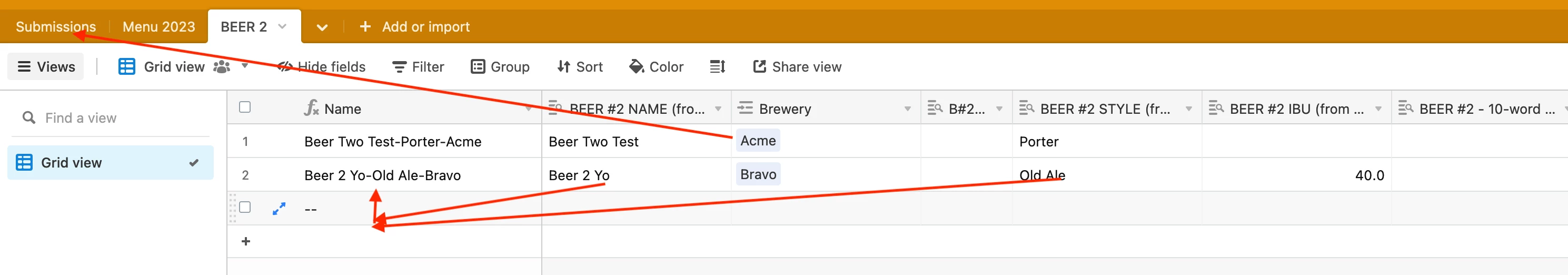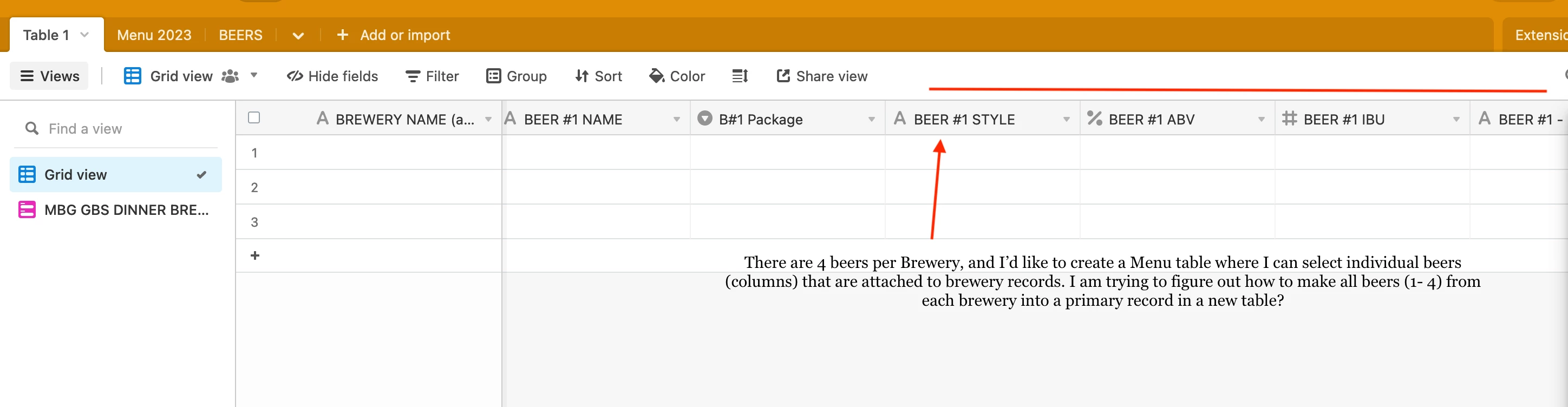 I'm relatively familiar with Airtable, but not in advanced manipulation. I have it setup with breweries as the primary records, because they're using a form to submit multiple beers per entry. However, now I want the beers to be the identifying record, while still maintaining their brewery info (contact, distributor, etc.).