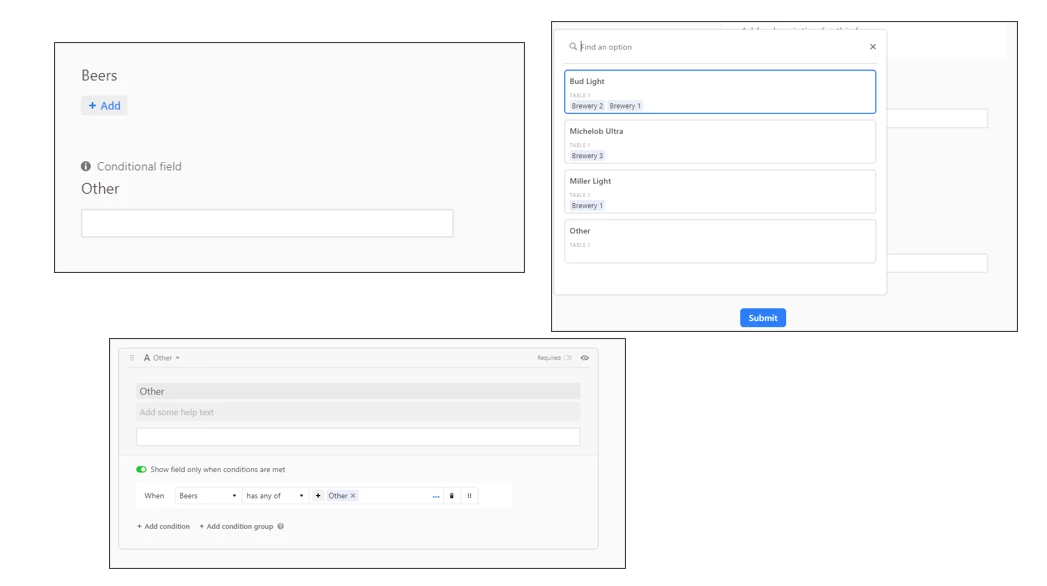Perhaps this is an introduction/need for pivot tables. I have a form collecting multiple submissions per brewery. I'm trying to create a menu that could draw from a table that shows the summary of those 4 submissions per brewery.