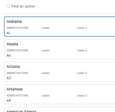I am creating a form for our website that I will need external users to fill out. I want to minimize user input error so I have created a table with state names/abbreviations to link to the form. When they start to fill out the state it populates options they can pick, but is there a way to make this look better by eliminaing showing where the data is going (it shows 'Leads' the table where it is going and I don't want customers to see that). Or is there a way to easily upload the state abbreviations that I have in the table without manually entering them all as a single select drop down option?