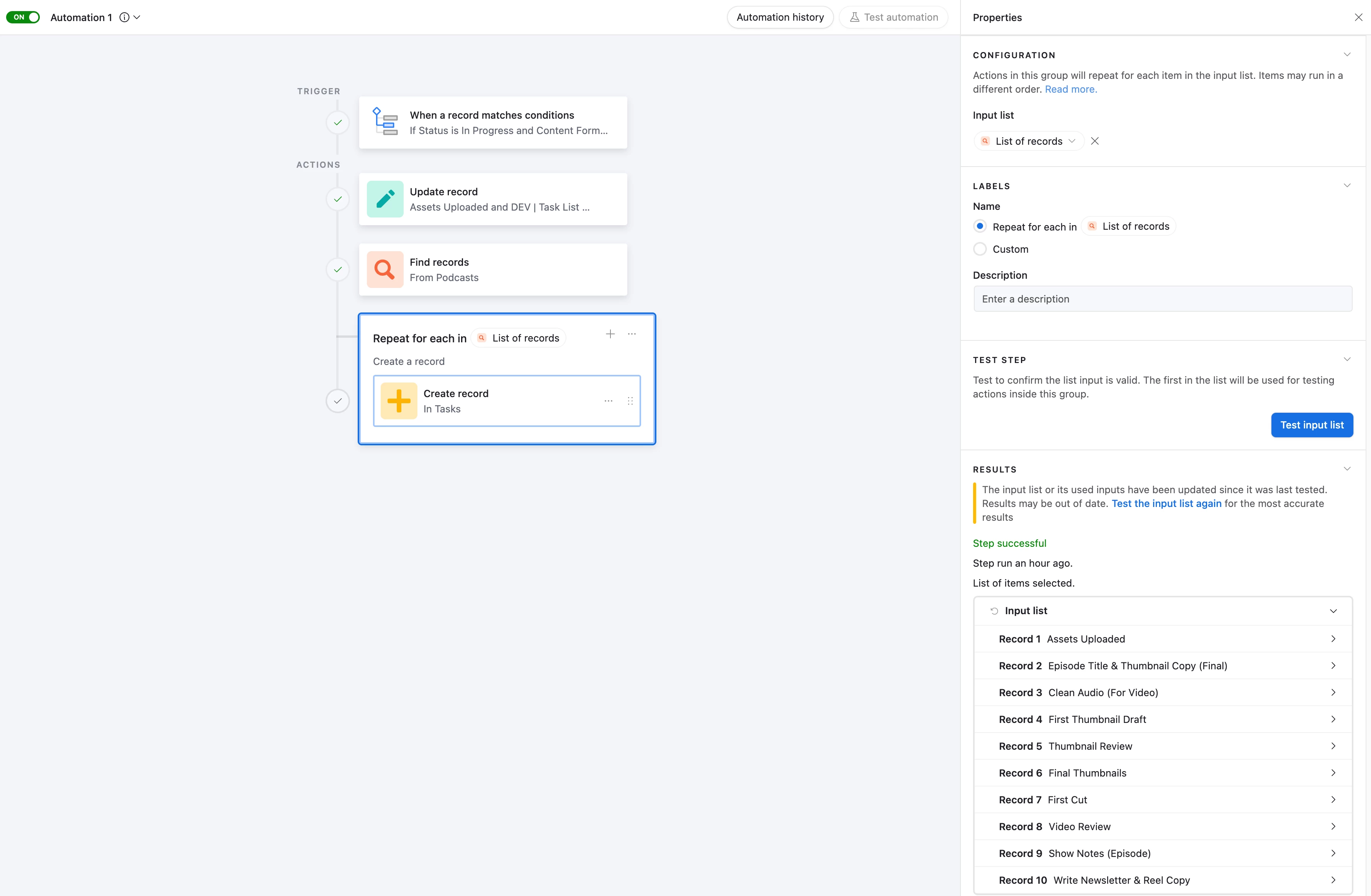 - Podcasts: The workflow here is simpler. When a podcast episode is published, the associated newsletter and promotional reel are published on the same day.