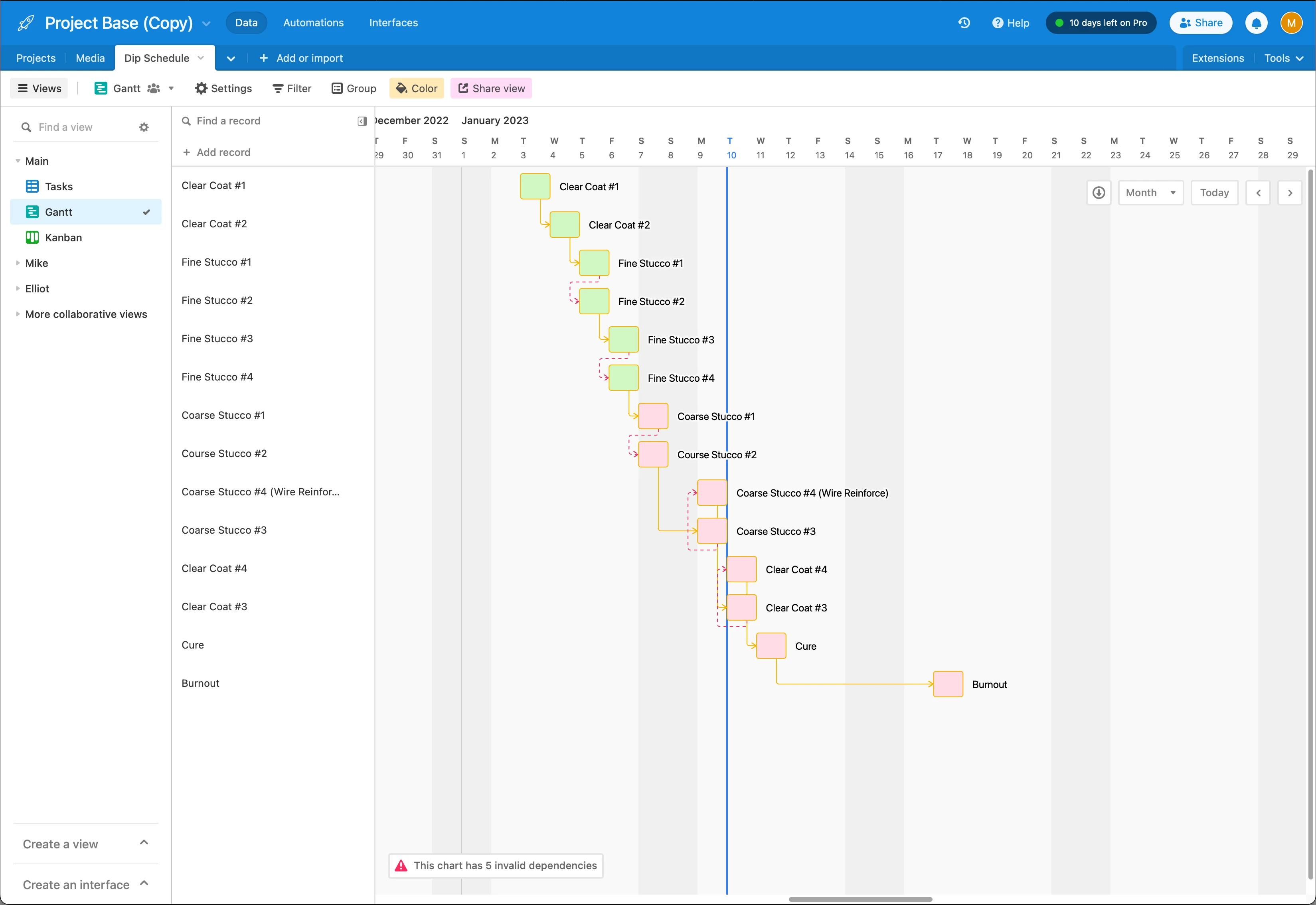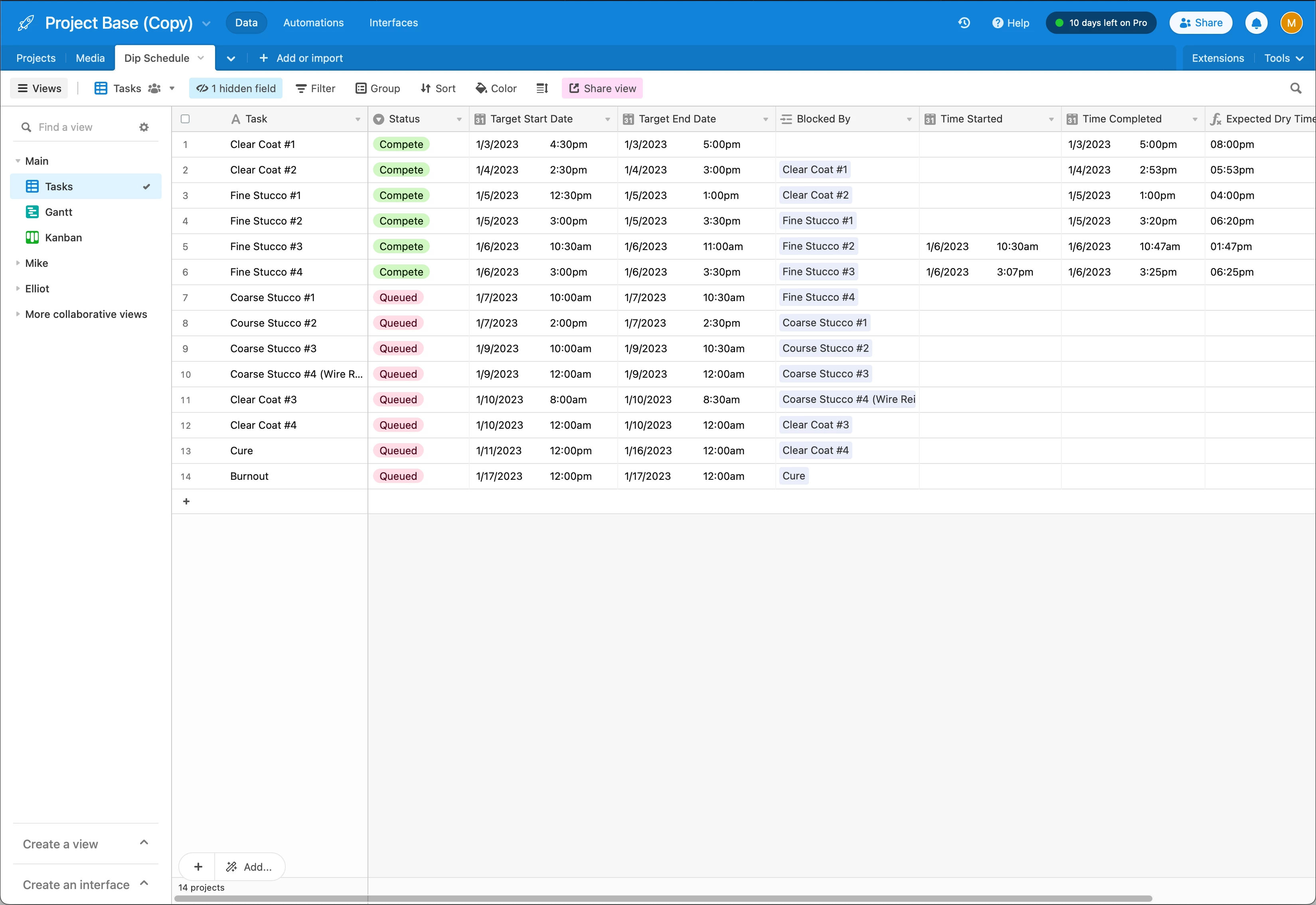 I am an artist that works with ceramics and have many repetitive tasks (each with several subtasks) that can take as little as 3 hours to complete and as long as 6 hours to dry... all dependent on the prior Task being completed on time. I created my first Gantt View. I entered both Start and End date fields with correct times for each of my tasks and I included dependencies.