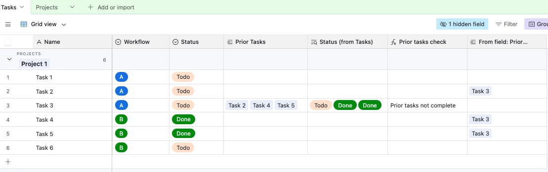 What’s the best way to set up Airtable so I can track cross‑workflow task dependencies like this? These two Workflow’s overlap with eachother so is there a way I can set up like Status’s for each task that when one task is blocked until xyz tasks are marked as completed?