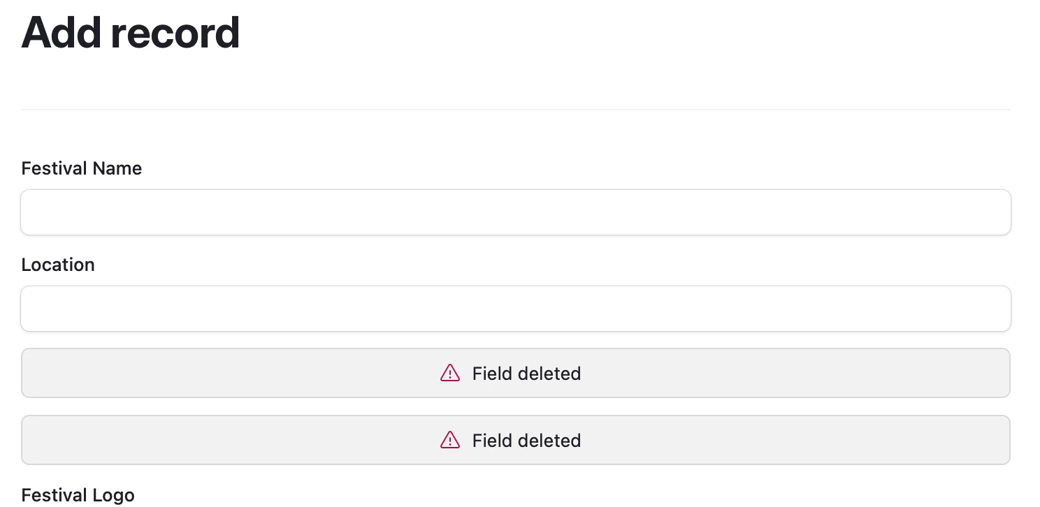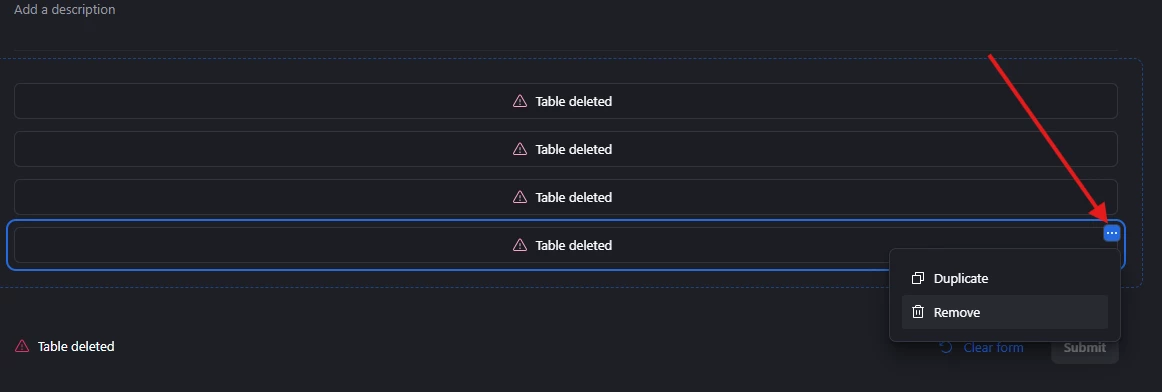 I am using a new base created with the help of AI. I have a form to enter data, however two blocks say “field deleted” and at the bottom, the “Create” button is greyed out, and it says “The form cannot be submitted because some of the fields have been deleted.” How do I delete these fields in a way that the form isn’t looking for them, and the form can be submitted?
