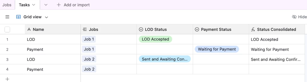 I don’t want to create a Single Select option for Tasks and Statuses as I want to “archive” old records so I can go back and see that and LOD was completed or a Pass Through was paid. Right now, I create a separate record for each Task (whether it is an LOD, Payment, or Pass Through) and then I have three separate fields or columns for a Single Select option for the Status of each Task type. This works until you build your Interface view. In a single Interface, without having to make another Interface, I would not be able to have an LOD record and a Payment record where the Record Detail ONLY displays the Status field that pertains to the specific task type. I would have to include the Status field of all Task types in the Record Detail which looks messy.