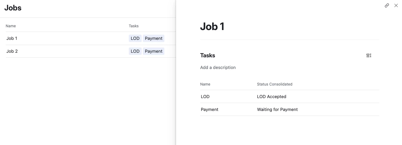 So I would name each task (1) LOD, (2) Payment, and (Pass Through). Each task would have the following statuses to track: