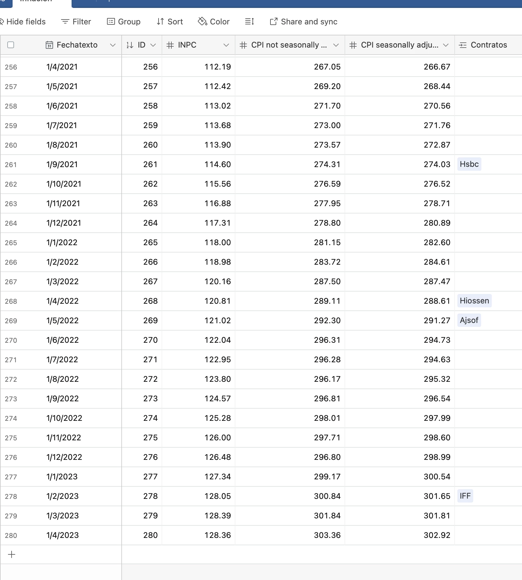 On another table I have inflation data. (Either CPI or INPC), Monthly data.