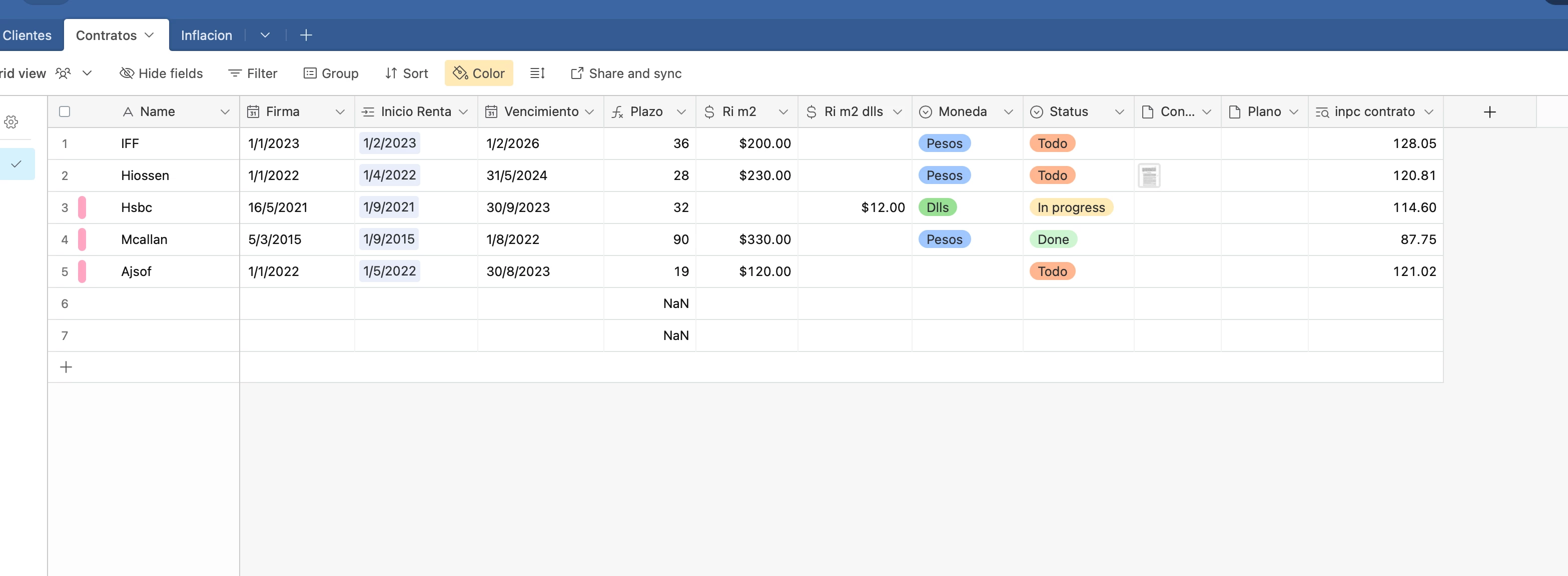 On one table I have the contracts data: Client, date of lease, term, area, price etc.