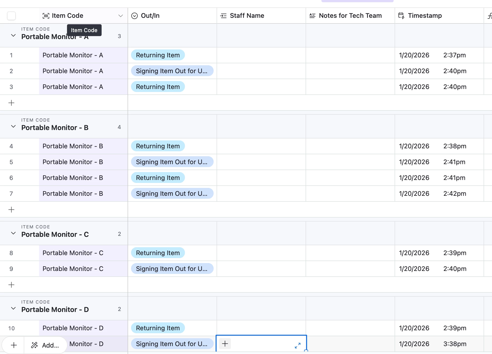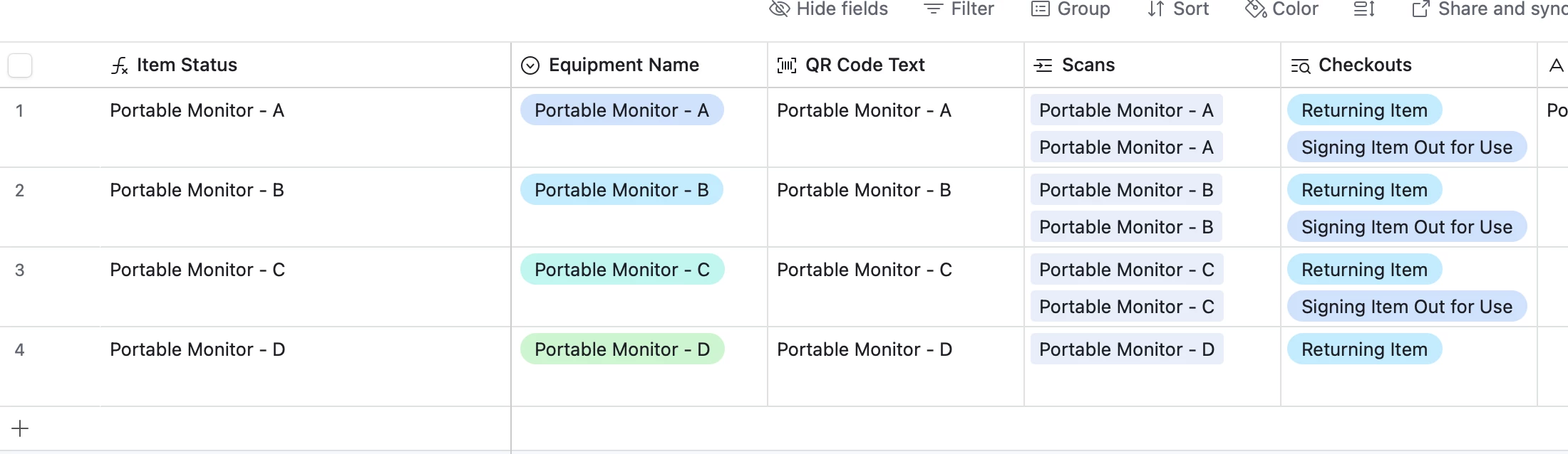 As you can see, I’ve tried a linked field, but I have to continuously select the Equipment Name of the item in my “Check-In/Check-Out Scans” table in order to get the list of checkouts into in my Equipment table. I feel like there should just be away to make this automatic, because my form already puts the correct text in my “item code” field.