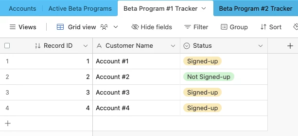 Hi - I'm looking for help building a tracker for customers that sign-up for beta programs. I have a table for Customers. And I have a table with a list of Beta Programs.