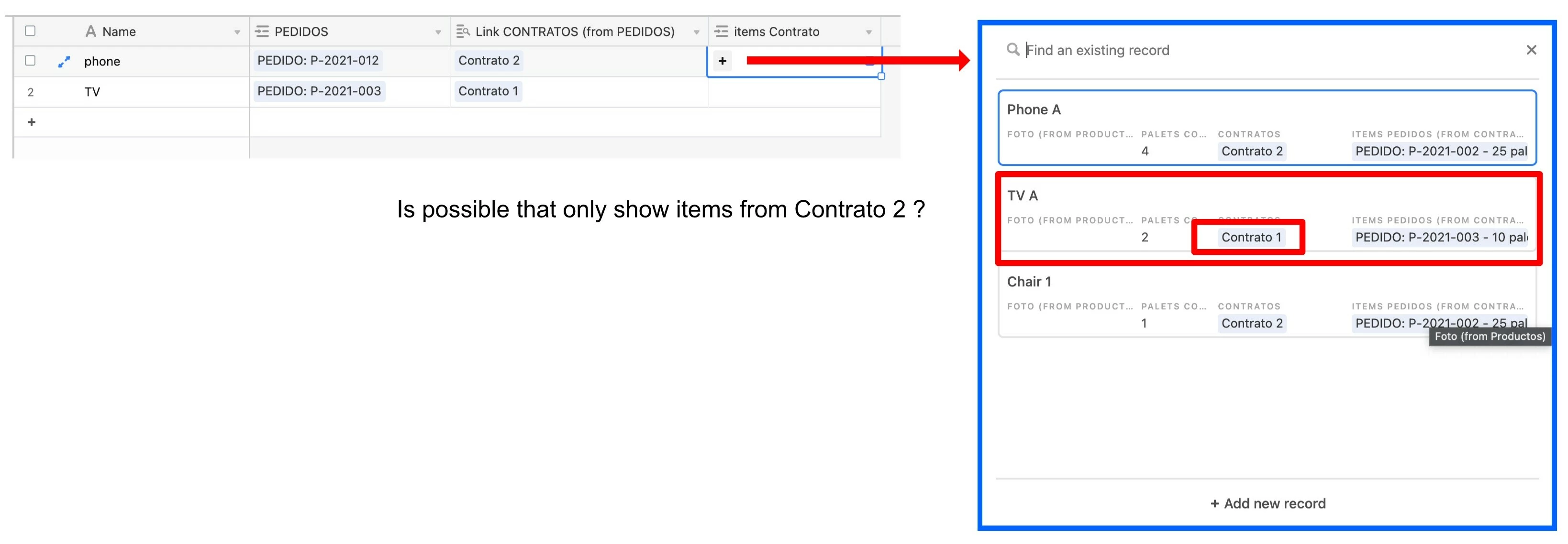 I’ve also done something similar with a separate table, having only 1 record in that table, that I link to all my records that I want filtered. In this case, the 1 record would link to the table feeding Items Contrato. Then, I set conditions that work for me, like records that meet a certain criteria. The downside to the method is you would need to set up an additional criteria, either a filter on/off switch or a time based criteria so your filter is only looking at the last modified record. I would attach screenshots but there would be a lot. If interested, I can walk you through it.
