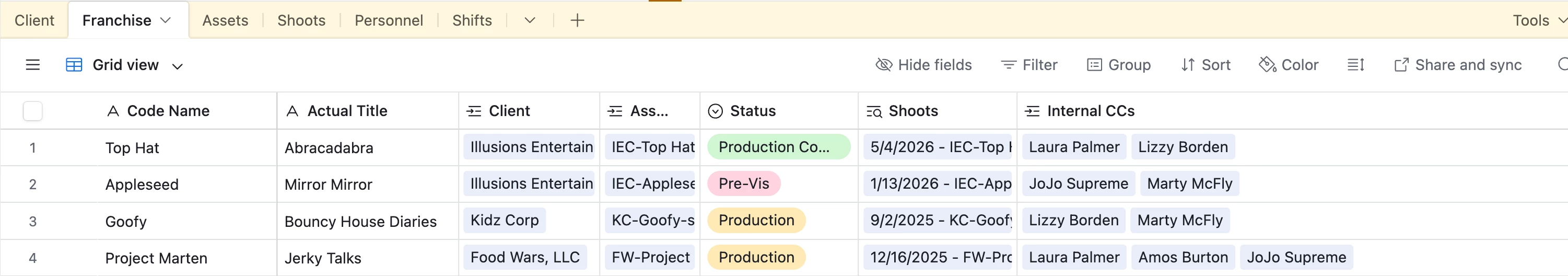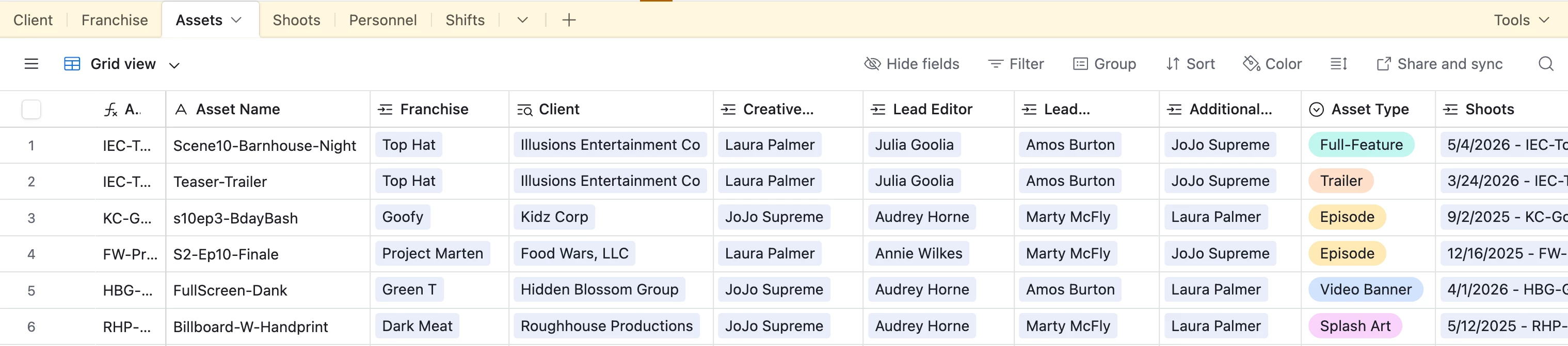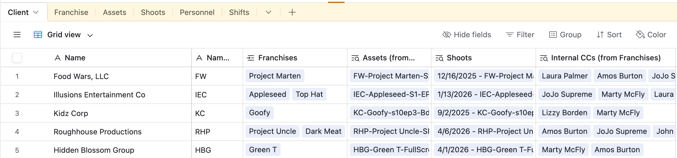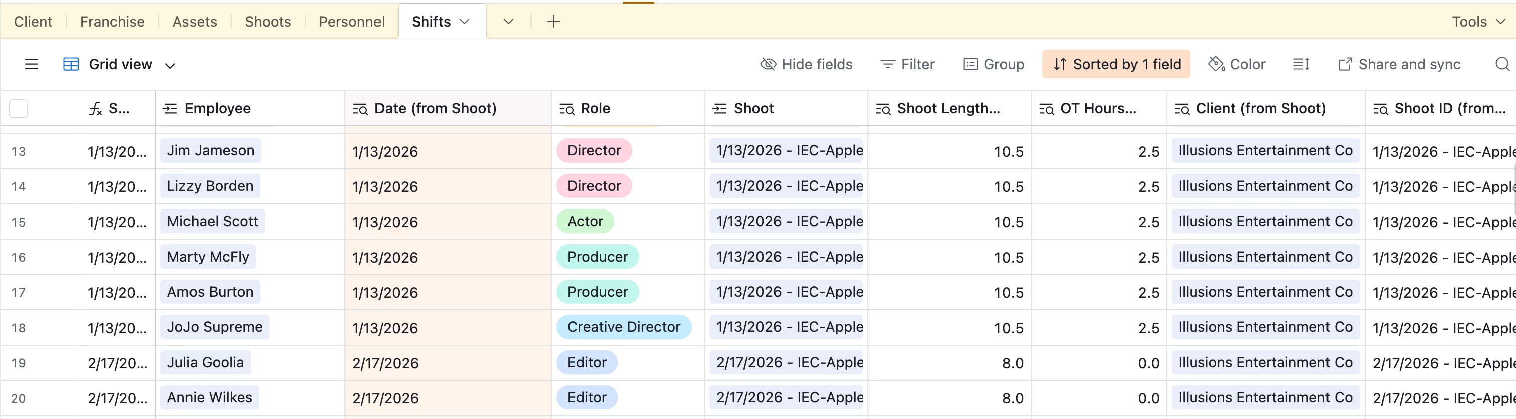 I am trying to create a breakdown of call sheets for group shoots and create individual “shifts” in a junction table. The goal is to be able to adjust start and end times for those linked in the shoots and to be able to create a more comprehensive reporting interface to track hours and OT by multiple criteria.