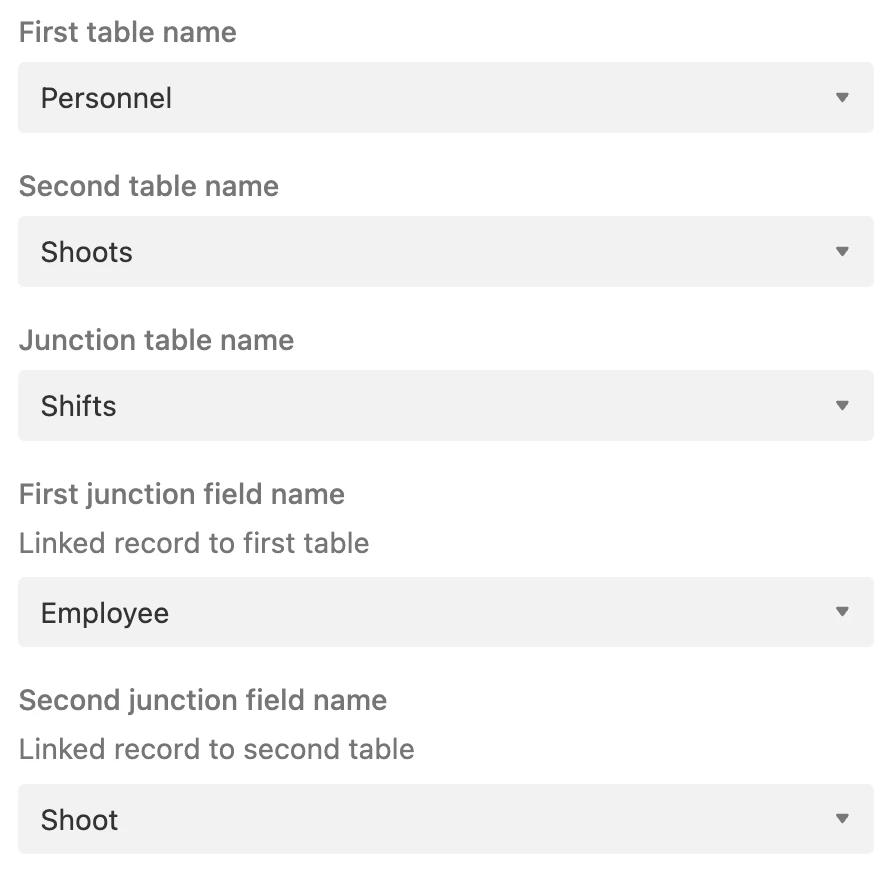 As you can see, it is pulling in combinations for Producers, Editors, and Creative Directors when they are not directly linked within Shoots. Is there a way to restrict the junction table to parse only what is directly linked between Personnel and Shoots? I only want to consider the “shifts” of Directors, Camera Techs, and Actors.