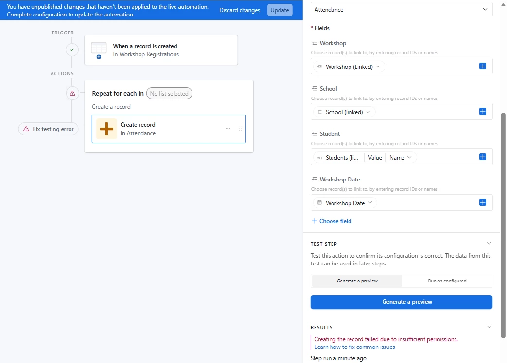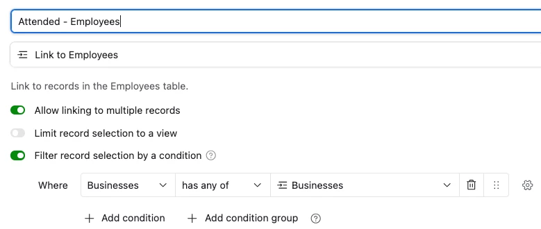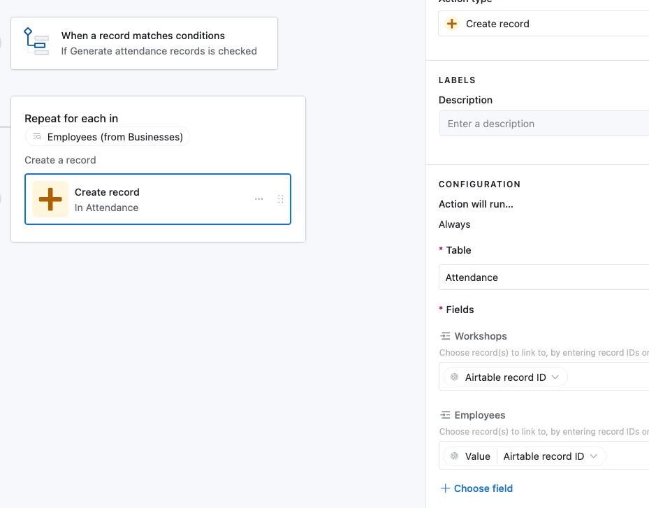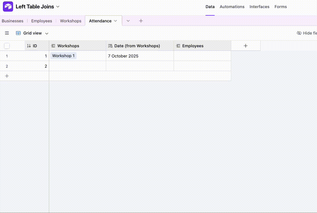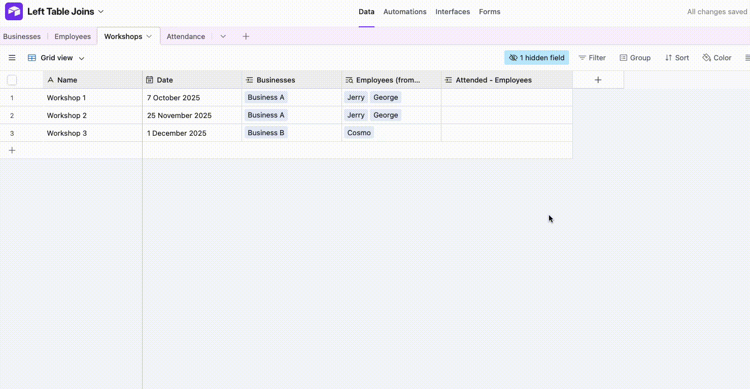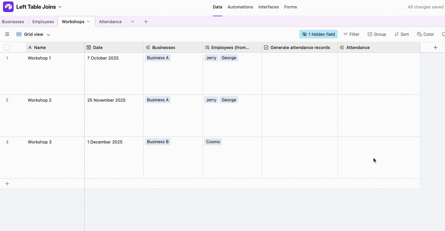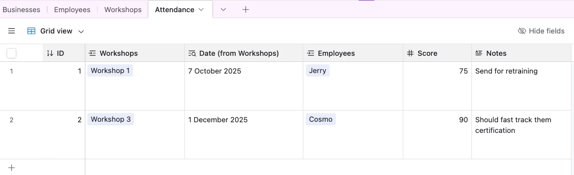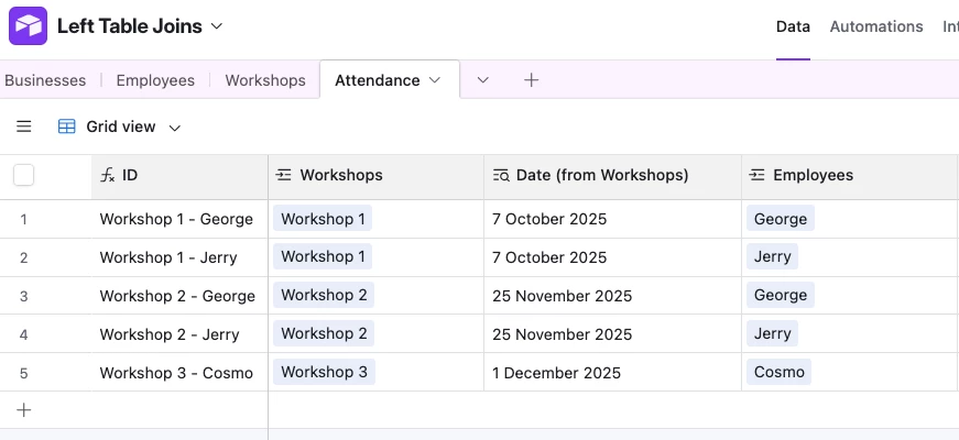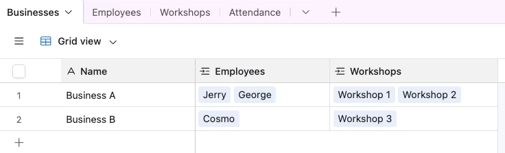 I want to create a table that tracks employee attendance for all workshops at all businesses. All employees attend all the workshops the businesses sign up for.