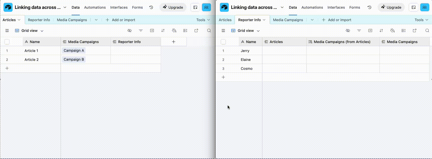 Automations: If for some reason or another you do need all three tables to link directly, it’s easy enough to make an automation that fires from the Article table, when a record has fields Reporter Info and Campaign are not empty. Then Update the Record in Reporter Info to link to the Campaign record in the Article table entry. One important thing to note is for that last bit you want to have the Campaign record have both the updated entry and the prior list of entries separated by a comma (otherwise it'll overwrite and basically enforce a 1-1 relationship rather than multi). It’s a bit more room for error and I’d recommend the Lookup version, but it’s definitely doable.