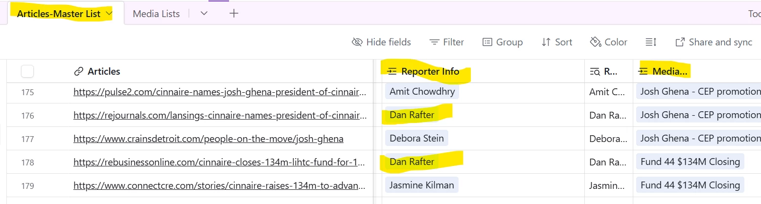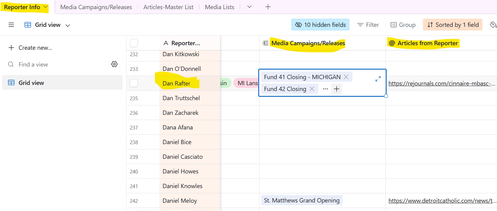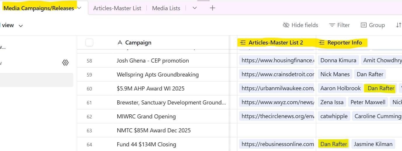 I track media hits through a Base with 3 tabs/tables: Reporter Info, Media Campaigns and Articles.