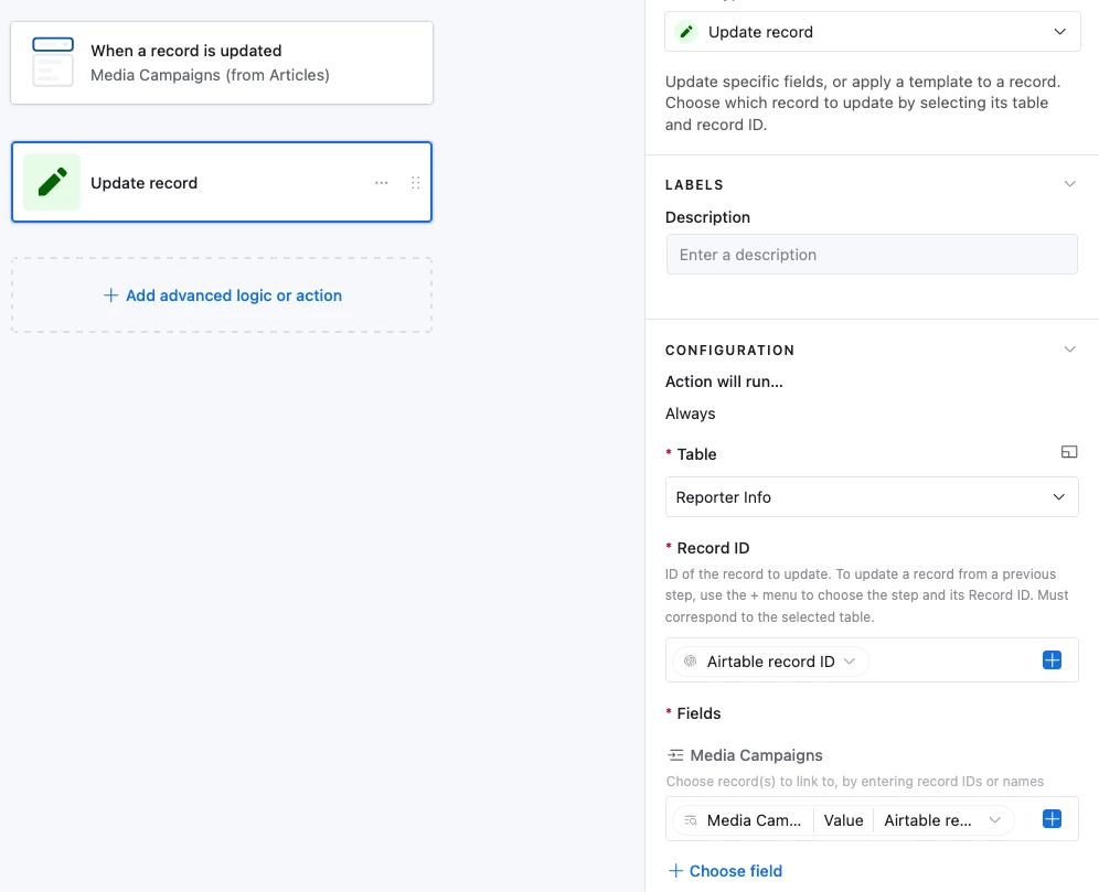 We first add a lookup field in Reporter Info to grab all the Media Campaigns the Reporter is associated with. Then we have an automation that triggers whenever the lookup field gets updated, and its action is to paste the lookup field value into the linked field in ‘Reporter Info’ to the ‘Media Campaigns’ table