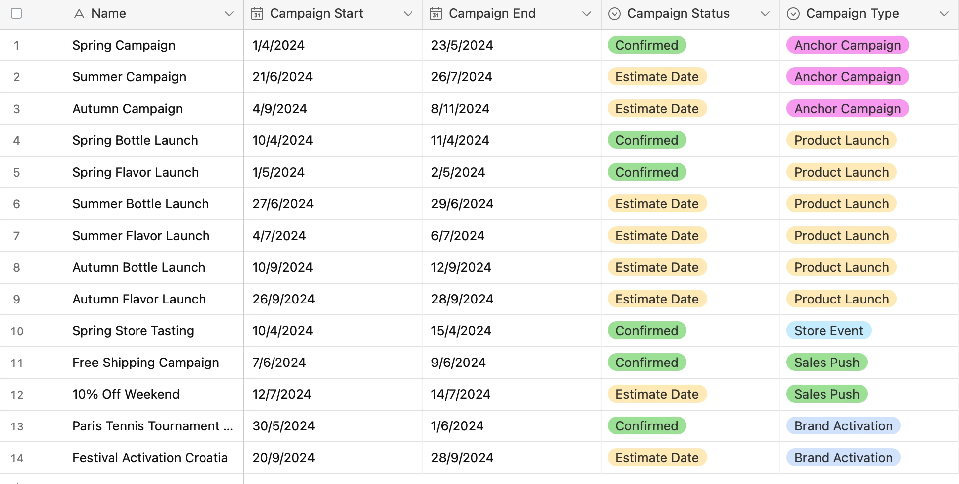 As you can see in the attached file, I want to Create a link between anchor campaigns and other campaigns from the same column. Anchor campaigns are the “major” campaigns happening throughout the year and all other campaign types are “subcampaigns”. I want to link all the subcampaigns according to their start and end date with the Major Anchor campaigns. Please let me know how I can achieve this?