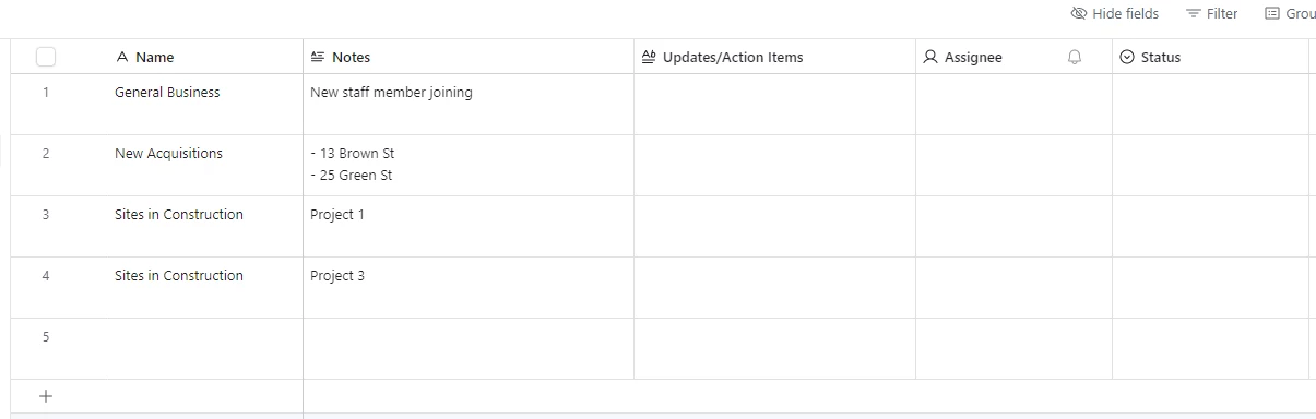 I guess what I was hoping to achieve was something similar to the agenda example below, where I can have agenda items NOT in the main table (such as General Business and New Acquisitions), and then automatically populate the sites in construction from the main table. I’m assuming this can’t be done in Airtable as pictured below as this is a mix of different things in the same column. Is there another way this could be achieved, or something similar?