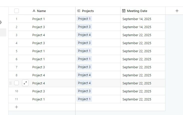 Hm, sorry, I’m not sure I follow! For me I would use the Agenda table by grouping by the ‘Meeting Date’ field, and that way I’d see each meeting’s agenda items, which would allow me to add notes to our discussions on Project 1 on 14 Sept, and separately add notes for discussions about Project 1 on 22 Sept, does that make sense?