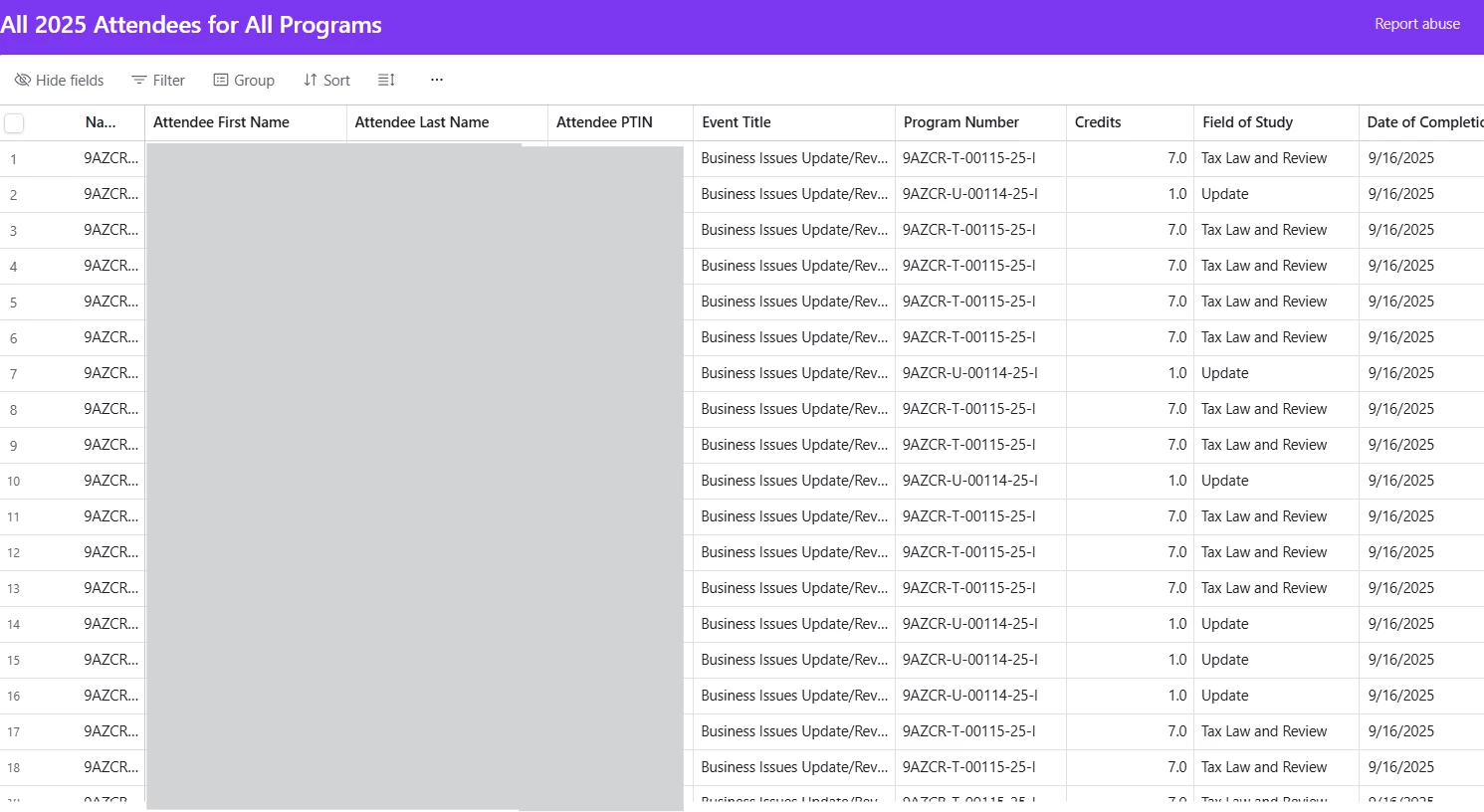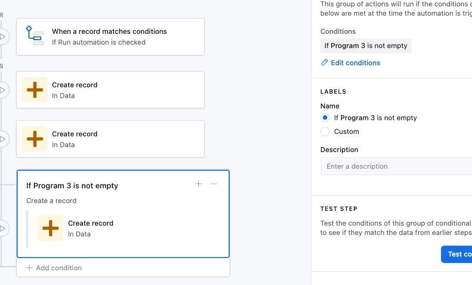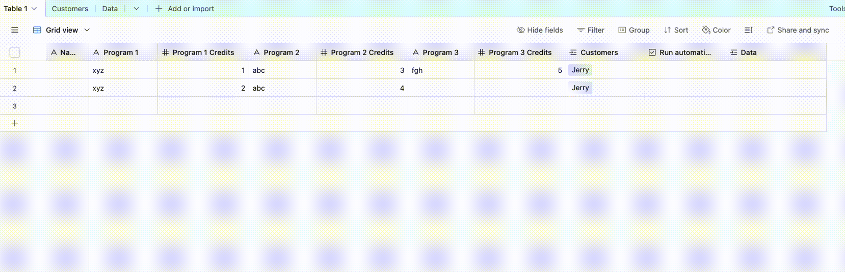 Hm, if an Event can only be linked to one Customer at a time, then I think I’d use an automation to create one record per program in another table to get the format you want, and I’d use a conditional to filter out the third program if it didn’t exist:
