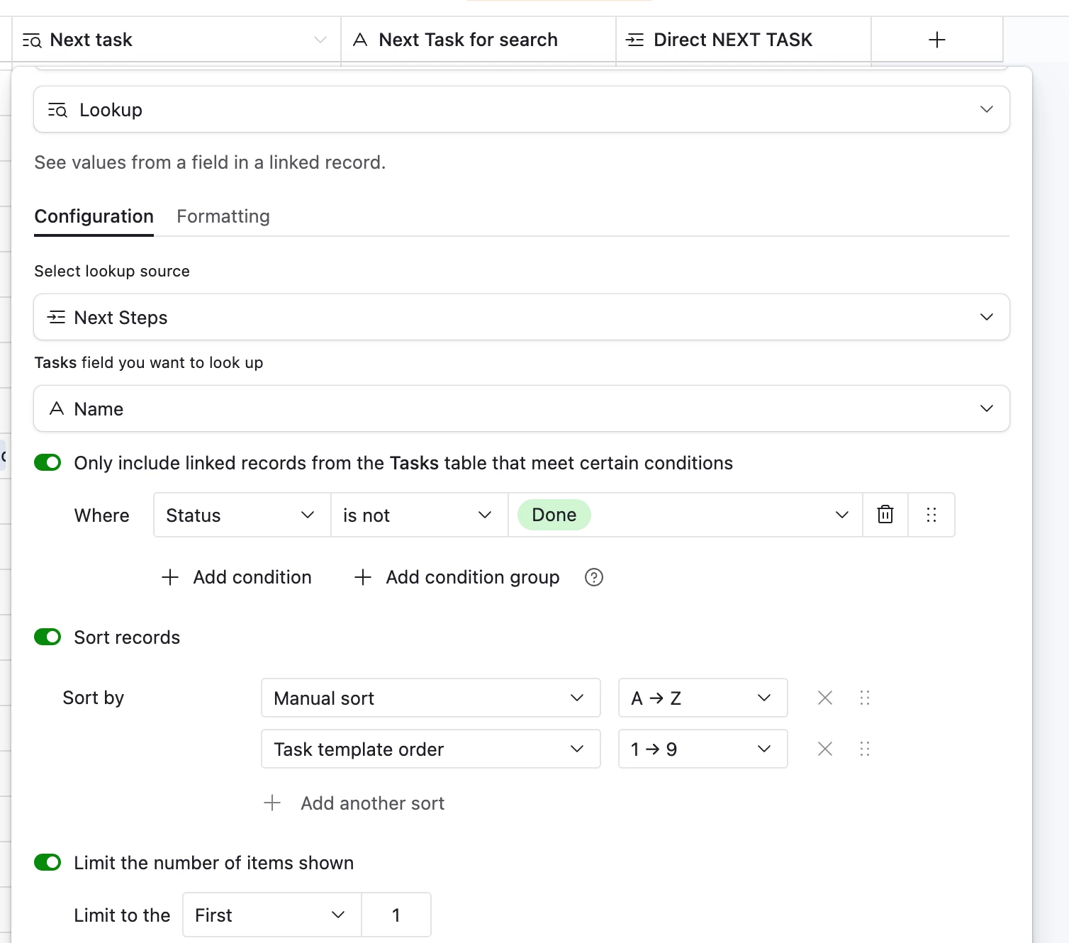 So client has 2 relations to tasks. One to all tasks, one to just the next task, which uses the field.Next task for search to find the right task
