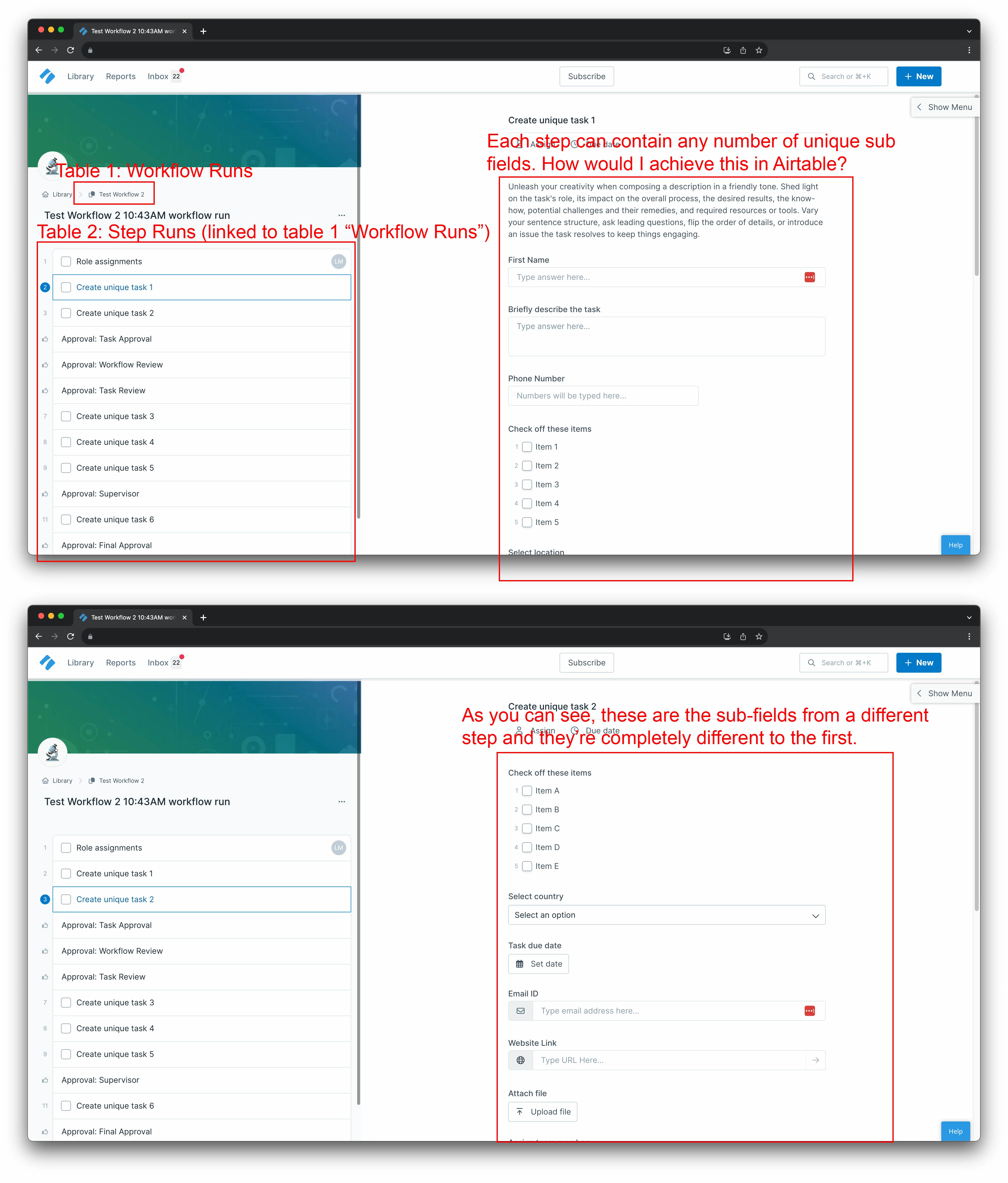 What I'm struggling with is how I can add unique sub-steps to each step similar to how it is done on the dedicated workflow software below (not Airtable):