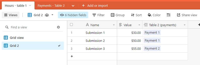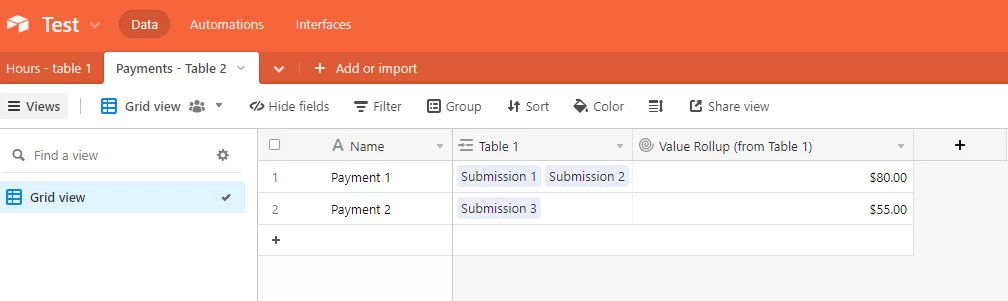What am I looking for is to simply create a database with table for hours that can be submitted by the form where table 1 catching Start Date (date/time), End Date (date/time), Number of Hours (end date - start date), Price (Number of Hours * 250), table of payments that I will submit by the form from table 2 catching the Payment Date, Payment Amount.