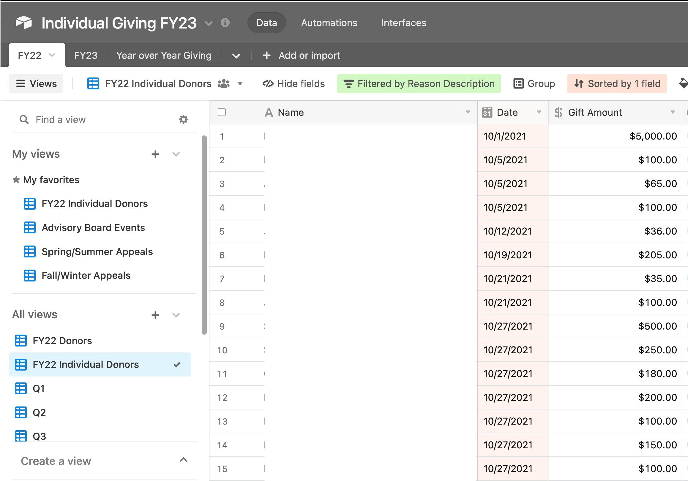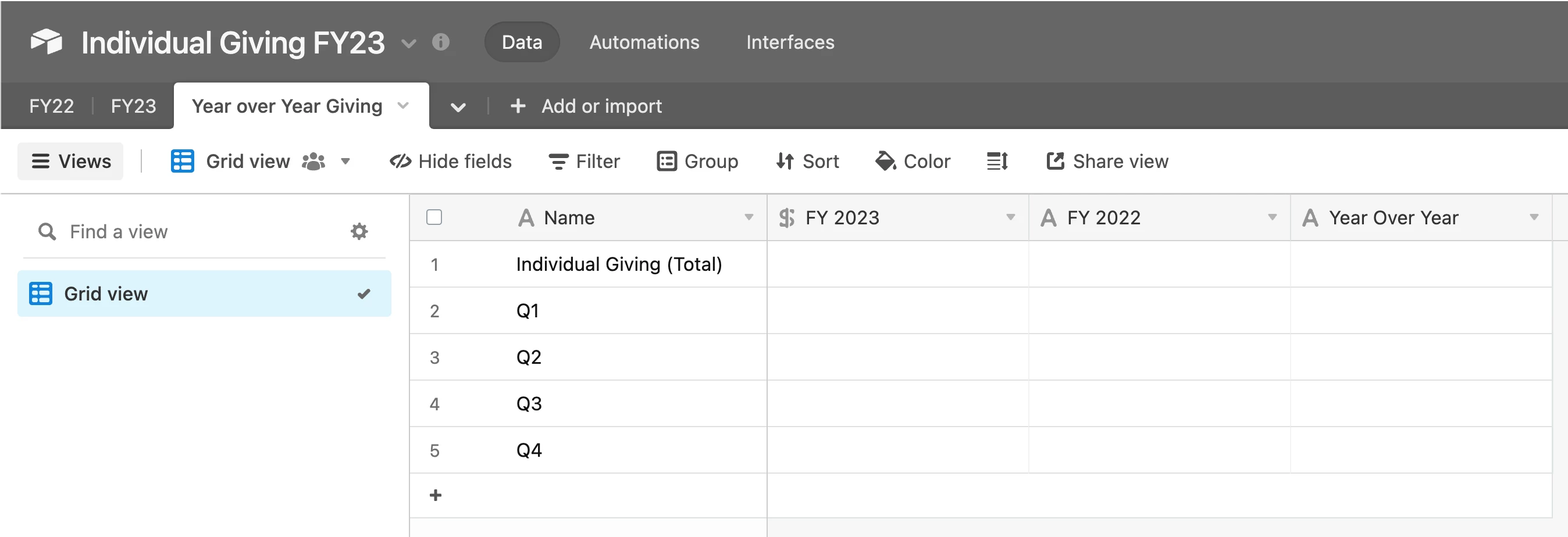 I made a base to better track and manage nonprofit donations. I have 2 tables set up: 2022 and 2023, with a third table I want to use as a summary table. Each table has a donor name, gift date, and gift amount, among other irrelevant information, as well as views broken down by quarter.
