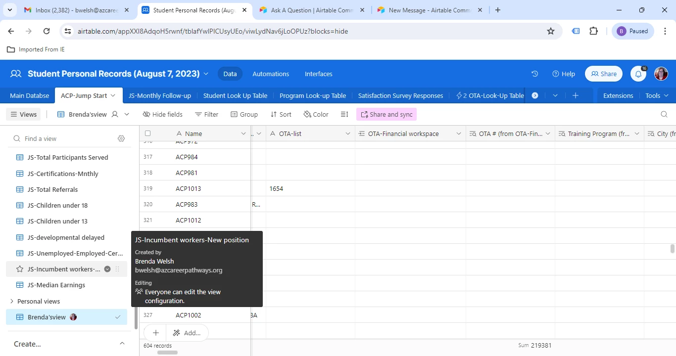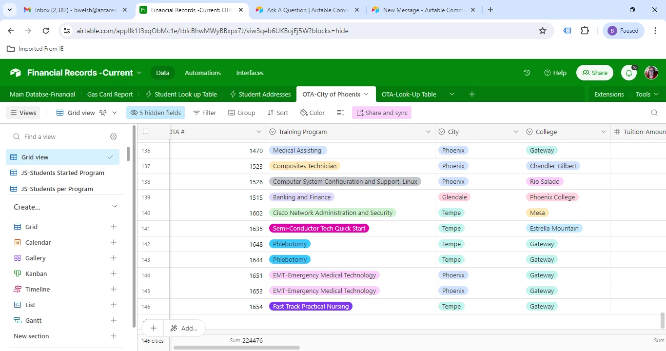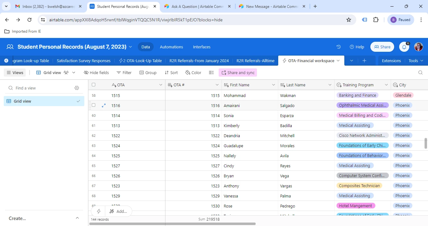 I have a student financial table named OTA Financial where the OTA number and other information is manually added. That is synced with the Financial workspace tab in the student table. Then the students are connected through the OTA number in the main student table to import information from the OTA Financial. I have spent several hours setting this up and connecting the OTA's. They were working. Then the next time I go into the table it is not updating the financial workspace tab with the information that is listed in the OTA financial. It is not letting me just sync the tables and I can't keep going over this and resetting it up every time I add a new person. What the heck is going on and why does it not work over a period of days?
