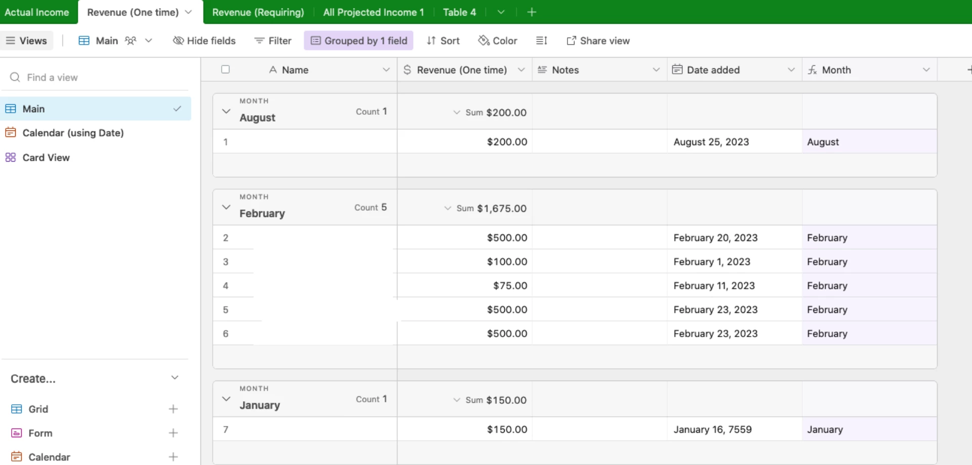 Currently, I'm only accounting for one-time revenue. I was thinking I could create another date column with automation to duplicate on the same day every month for recurring payments.