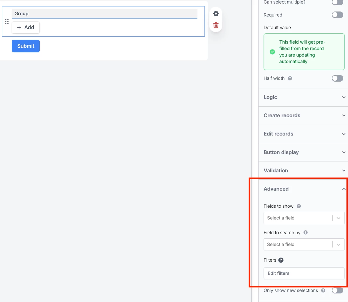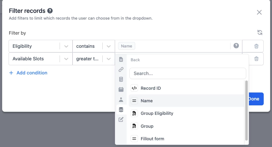 Then in Fillout, try setting up filters like this on the linked field ‘Groups’: