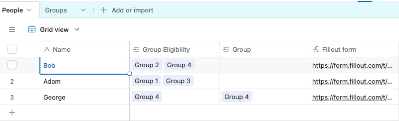 The idea is this: let’s say on some column in Airtable, Bob is only eligible for groups 2, 4 and Adam is eligible for groups 1 and 3, is there a way for Fillout to read this information on airtable and then create a personalised URL that gives Bob a form asking him to pick only between groups 2 and 4, and similarly with Adam?