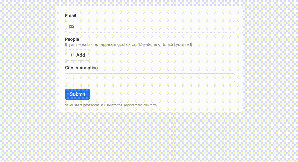 My idea was to use Fillout to ask for a user’s email- if that email already exists in the database, they would get a shortened version of the form that only requires city specific information. If they are a new user, they would see the entire form.