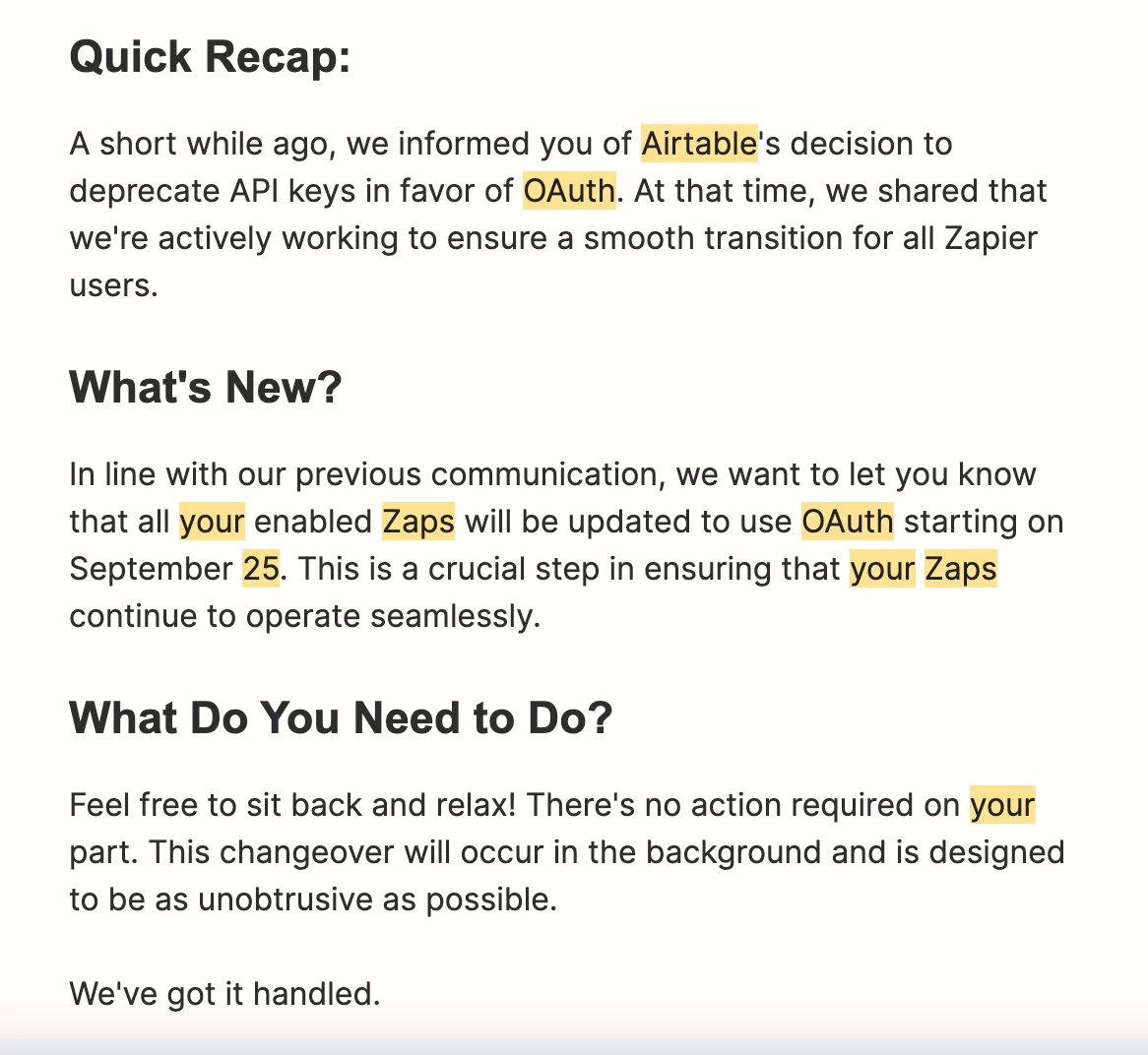 Zapier Email: Your Airtable Zaps are switching to OAuth on Sept. 25