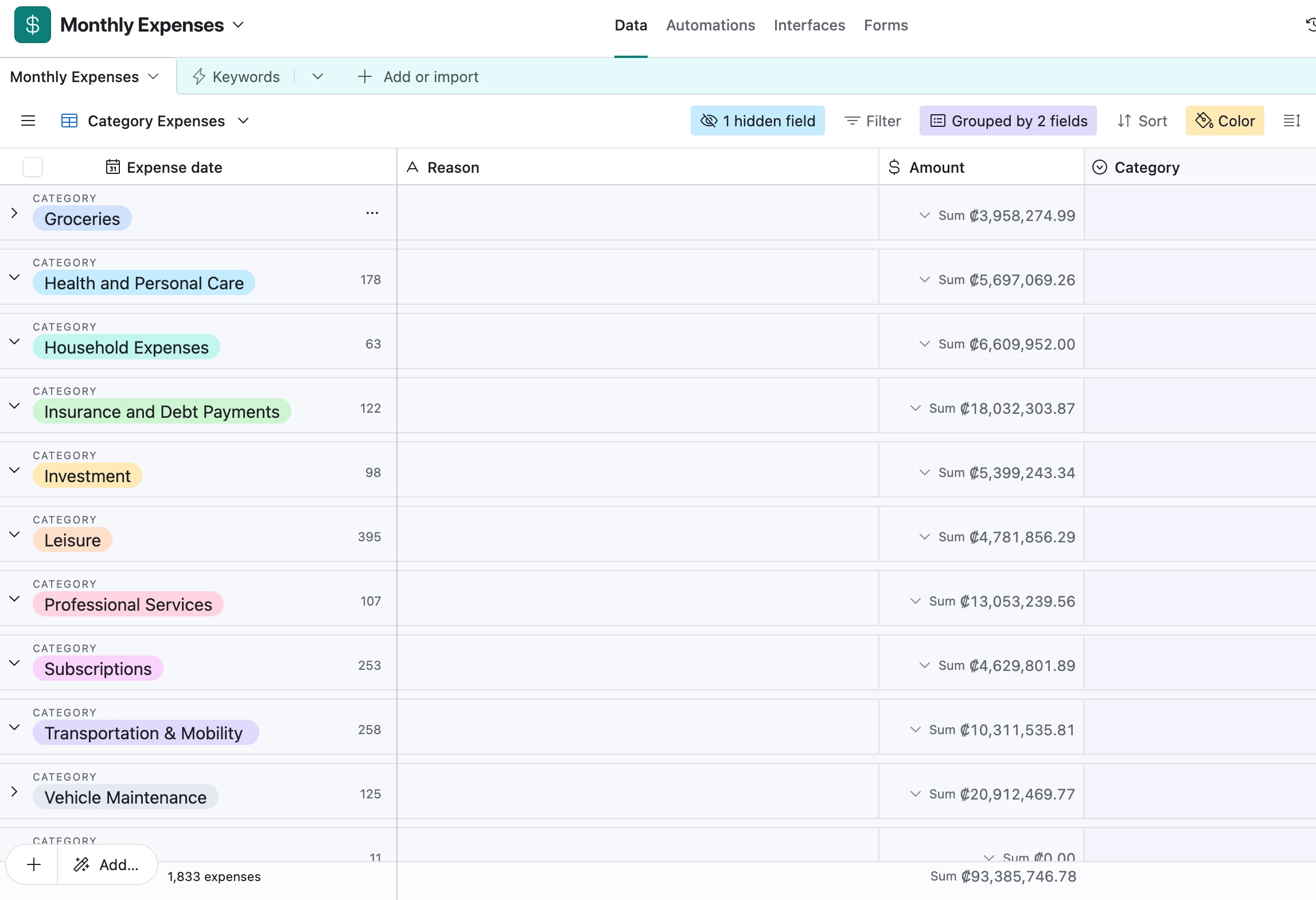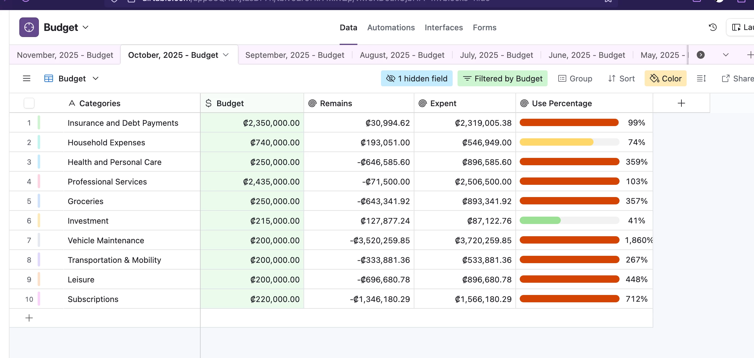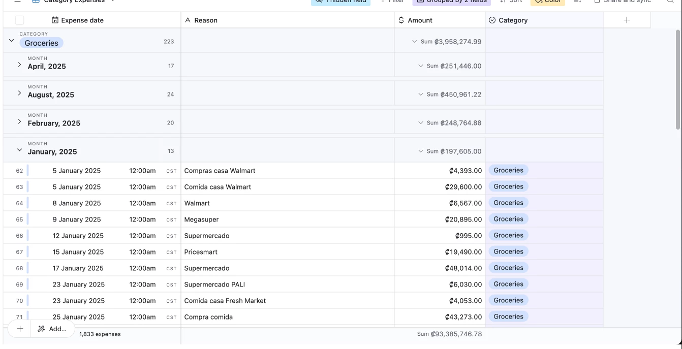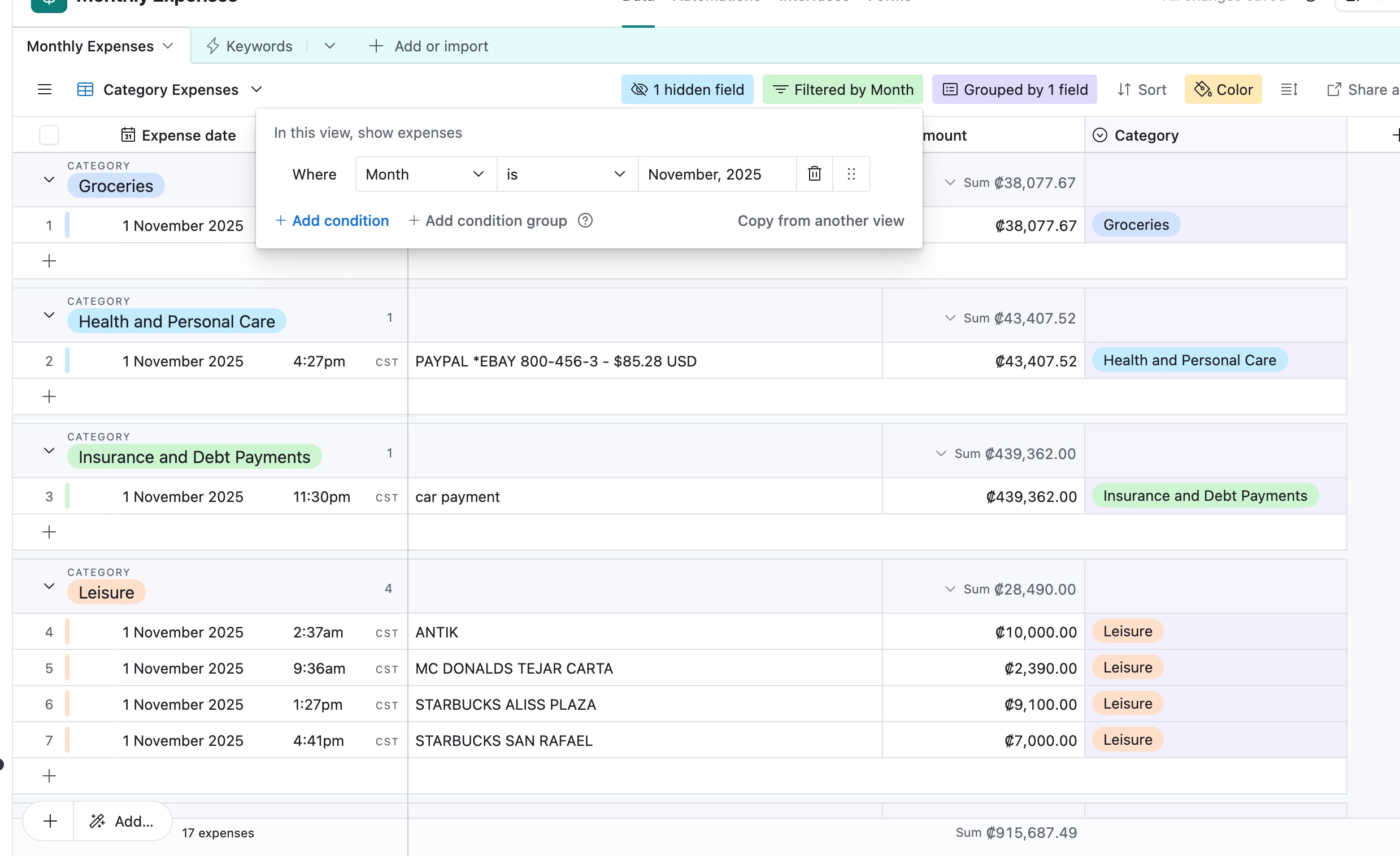 In Airtable, I usually have a table for all transactions, and each transaction is tracked with its expenses and currency conversions. Every time I make a transaction, it is automatically tracked in a single Airtable table that has the transaction category, amount, date, and details of what it was. This same table is divided into months. Each view is a month, and it is filtered by transaction month.
