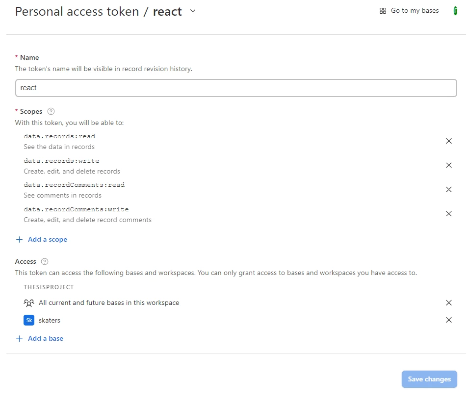 I've created a base table on Airtable. Then from the developers/API key section, I created a token. I've copied the Token ID from the personal access tokens section and pasted it directly .env file. I filled the information correctly.