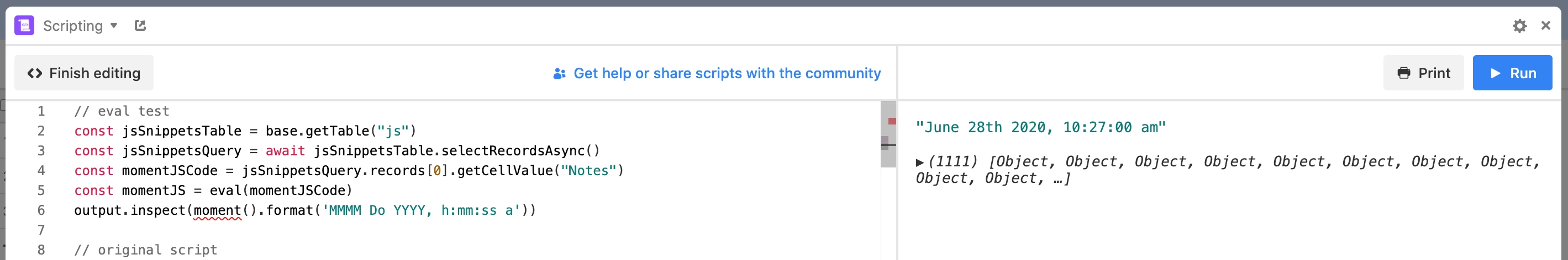 This business requirement is daunting – indeed, impossible given the nature of Script Blocks. I’m sure the Airtable folks have pondered this, but as it stands, it’s off the table for now, right? Indeed, Script Blocks are simply not capable … until and unless … you factor in the amazing power of that which Airtable is known and most famous for - simple data/content management with an intimate relationship with integrated script.
