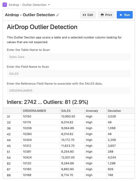 output.markdown('This Outlier Dection app scans a table and a selected number column looking for values that are not expected.');