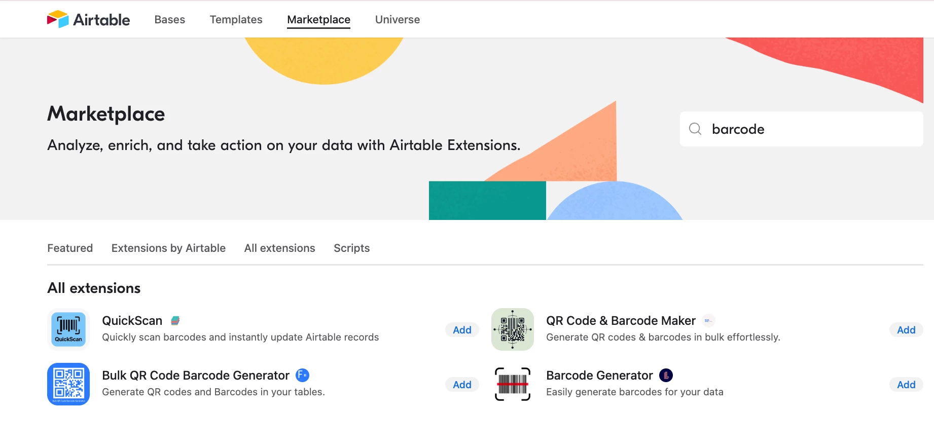 There are a few different QR Code generators in the Airtable Marketplace, although I haven’t personally used any of them because I generate all of my QR codes by using Make’s Barcode module.