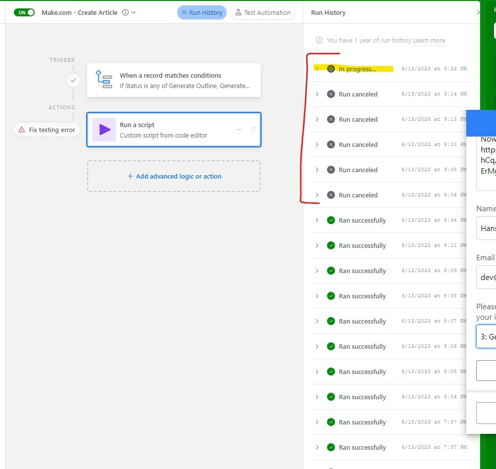I am trying to run a script on a record update, but when I look in the Run History, all the trials end up in the “In progress… Step pending…” state.