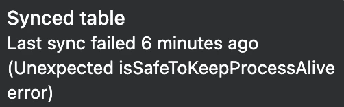 Synced tables - 'Unable to sync this source. Unexpected isSafeToKeepProcessAlive error' - BUG