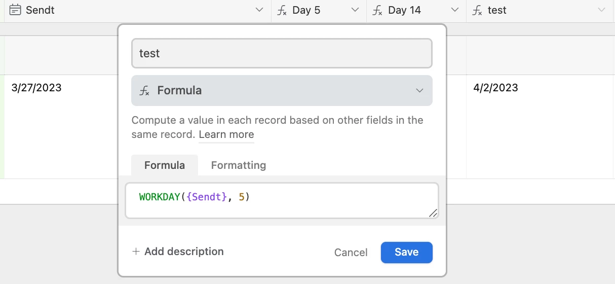 I am trying to create formulas that skips weekends, showing 5 days after a date field called Sendt (and then two other formula fields for 14 days later and 30 days later)