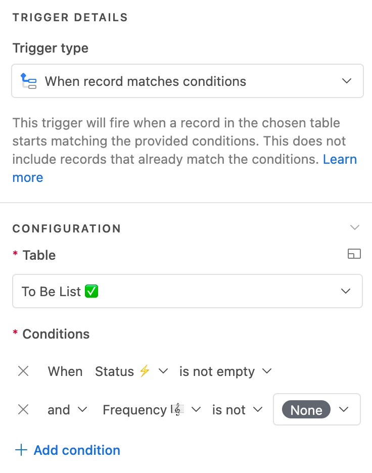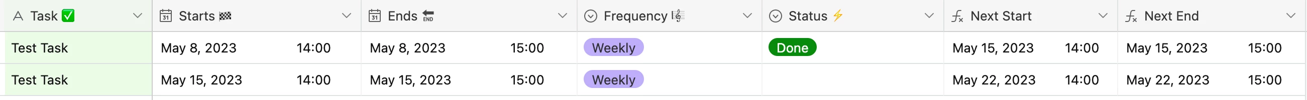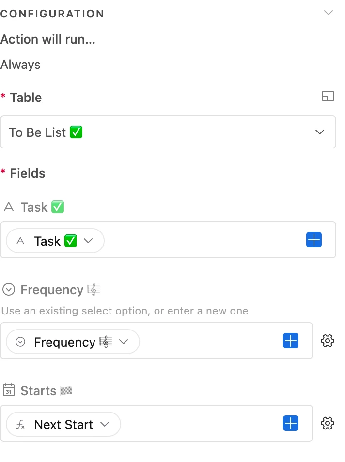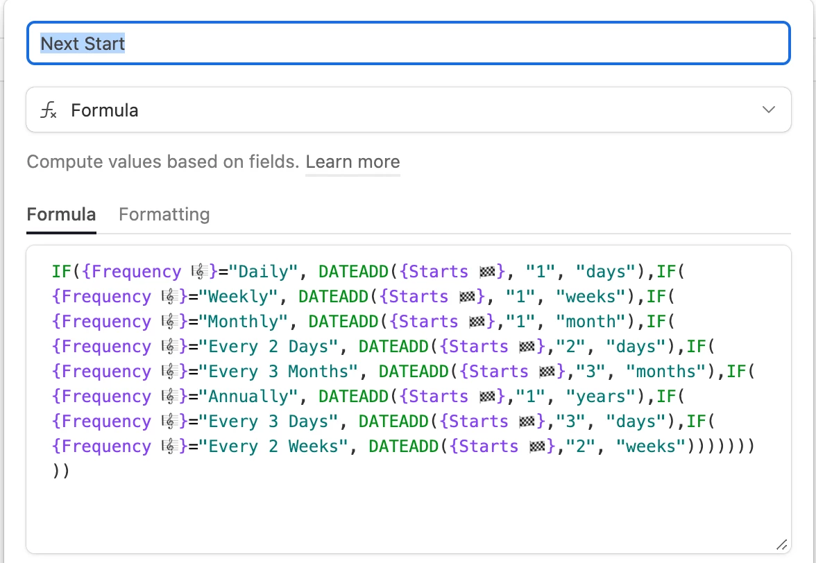 I created a Base to track my to-do list using several formulas and automation to reoccur each "done" task based on the set frequency of the task. For example: if the task frequency from the drop-down list is "weekly", then I created a formula that it will only reoccur weekly. However, if I want the task to reoccur on certain and multiple days of the week (e.g.: Monday, Wednesday & Friday), is there a way to do that without creating the task three times?